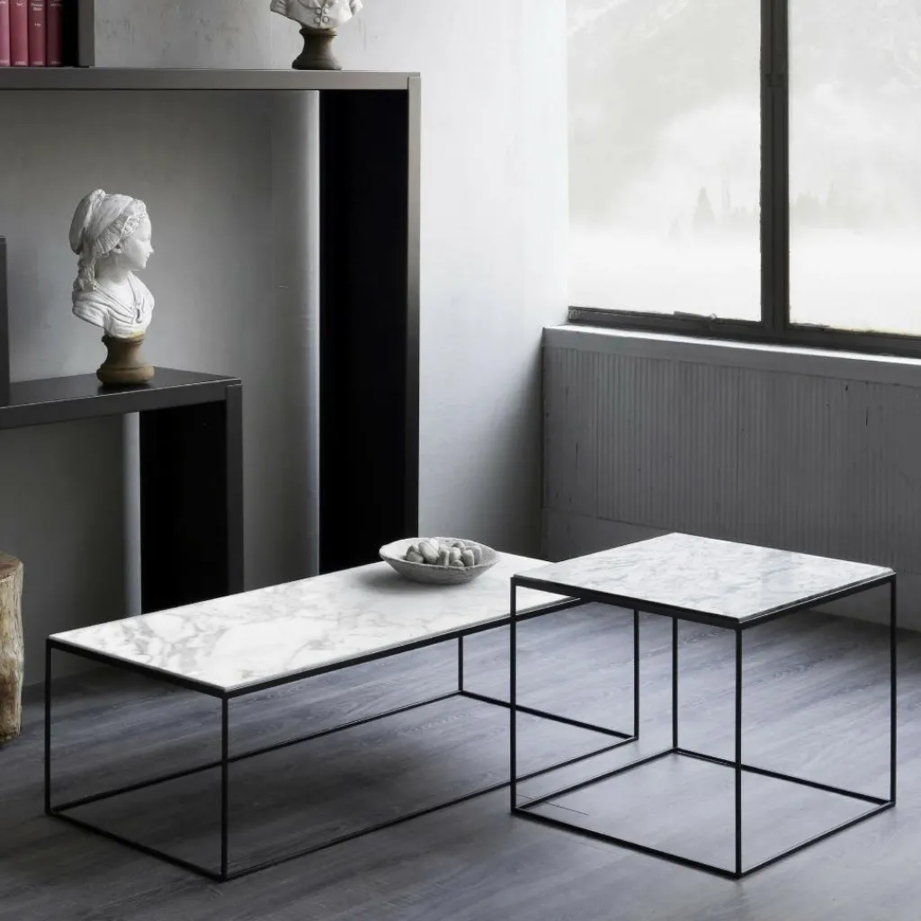 Der Slim Marble Beistelltisch 54x54x48cm ist ein richtiges Kunstobjekt: Für die Tischplatte verwendet der Designer edlen Marmor. Der Werkstoff, der schon in der Antike bekannt war, strahlt Eleganz aus. Da die Oberfläche eine individuelle Maserung aufweist, ist jedes Stück einzigartig. Die Marmorplatte ist 2 cm dick. Einen interessanten Kontrast zur Tischplatte aus Stein bildet das filigrane Gestell. Es ist wie ein Würfel geschnitten und besteht aus Stahlrohr. Dieses ist viereckig und hat eine Seitenlänge von 0,8 cm. Der Slim Marble Beistelltisch 54x54x48cm wird nachhaltig produziert: Metallabfälle werden einer anderen Verwendung zugeführt und der Tisch kann recycelt werden.