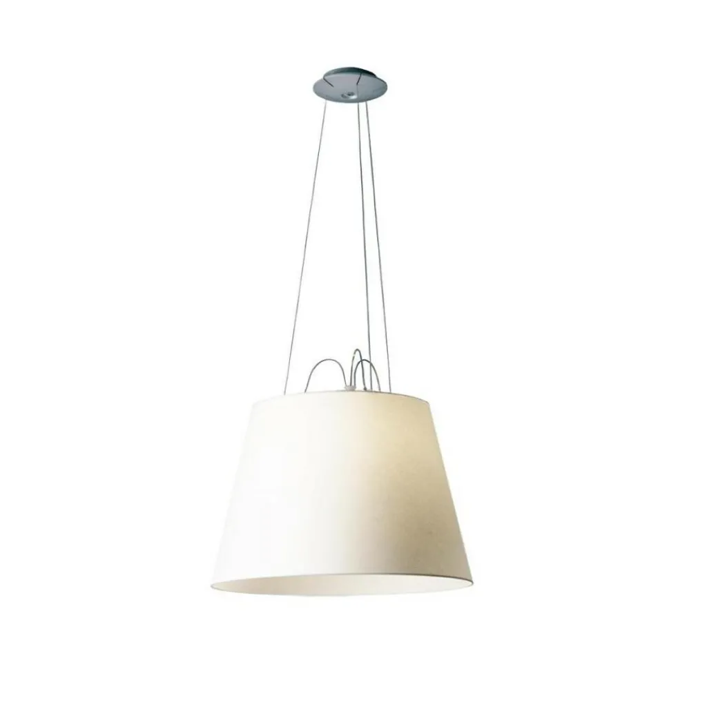 Zum Blickfang der Tolomeo Mega Sospensione Pendelleuchte wird der edle Leuchtenschirm, der aus Pergamentpapier oder Seidensatin besteht. Der konisch gestaltete Leuchtenschirm wird nach unten hin etwas breiter. Das Licht dringt durch das transparente Material durch und wird nach unten weitergeleitet. Somit ist die Tolomeo Mega Sospensione Pendelleuchte eine perfekte Zonenbeleuchtung. Durch ihr schlichtes Design harmoniert die Tolomeo Mega Sospensione Pendelleuchte mit jedem Einrichtungsstil. Sie verbreitet im Wohn- oder Esszimmer, im Büro und in jedem anderen Raum wohnliches Flair. Zur Befestigung an der Decke dienen drei filigrane Aluminiumseile, die gleichzeitig als Stromzuleitung fungieren. Der Schirm scheint wegen der zarten Aufhängung im Raum zu schweben.