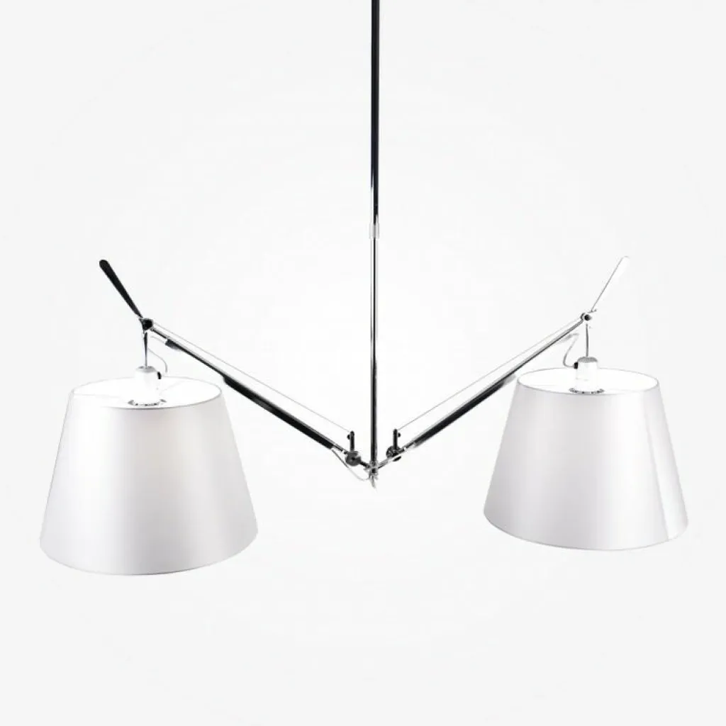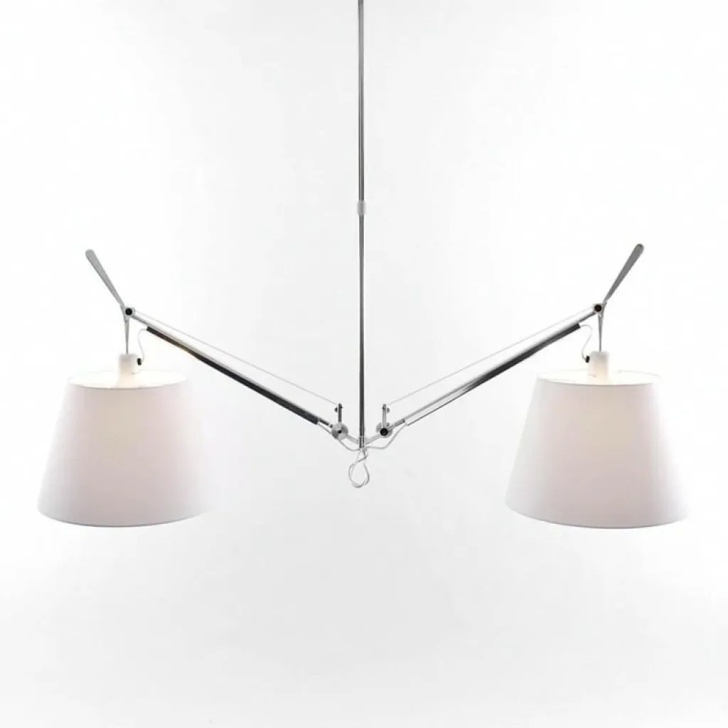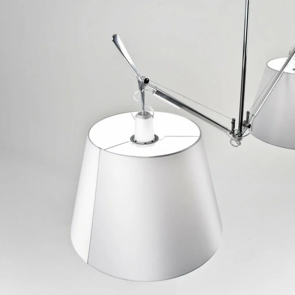 Eine besonders vielseitige und flexible Deckenleuchte. Durch das durchdachte Tolomeo Ausgleichsfeder-Systems und den höhenverstellbaren Stab kann man die Lampenschirme in eine beliebige Position bringen. Das Licht lässt sich somit immer dorthin lenken, wo es benötigt wird. Gestell, schwenkbare Armen und Gelenke bestehen aus glänzendem Aluminium, die Lampenschirme aus Satin. Der Satinschirm besitzt im ausgeschalteten Zustand eine aluminiumgraue Färbung, im eingeschalteten Zustand wirkt er strahlend weiß.