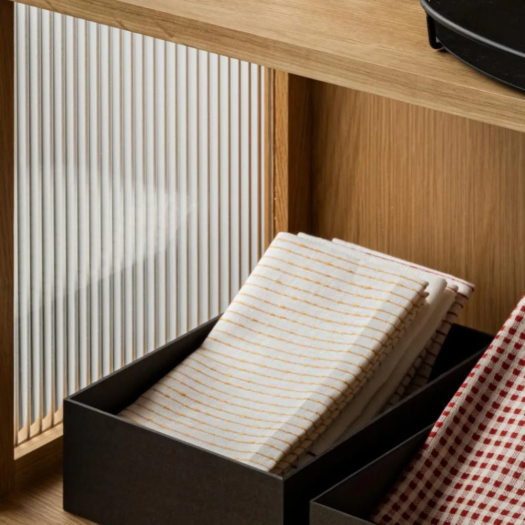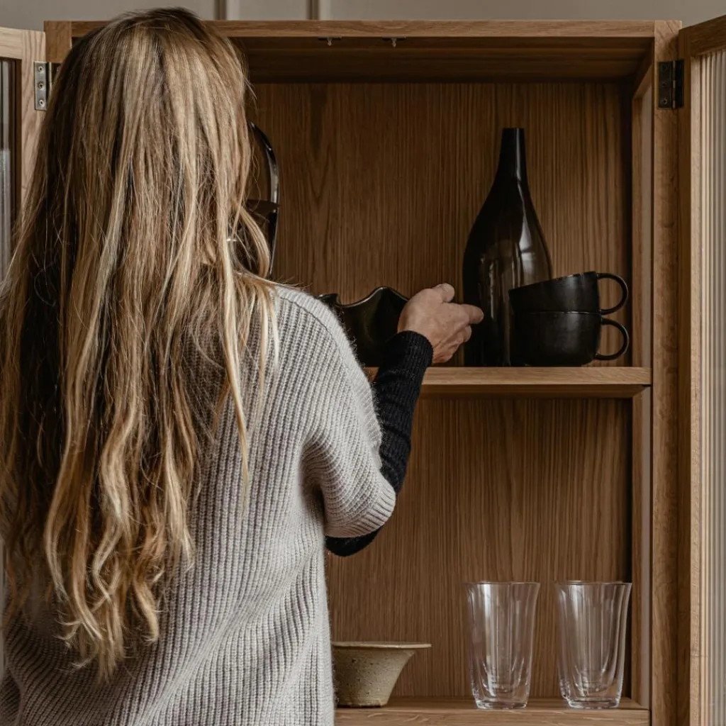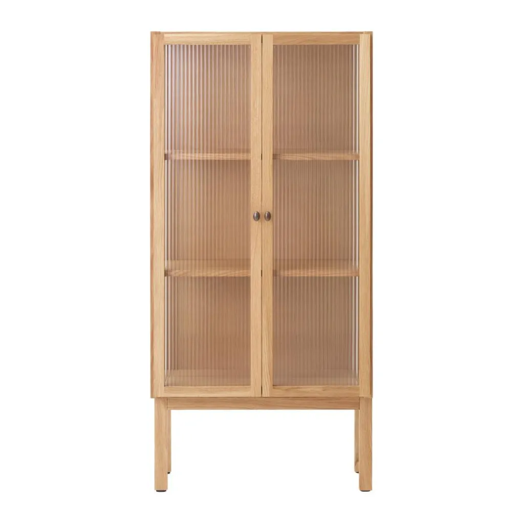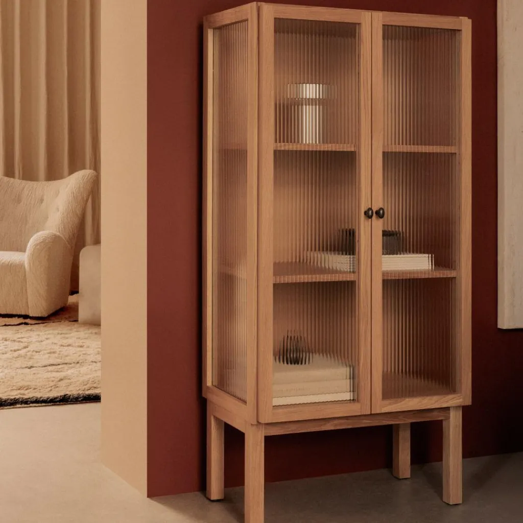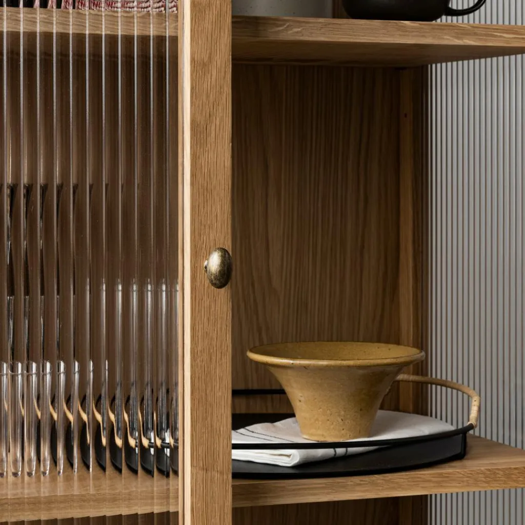 Die Curiosity Vitrine H 143 cm ist aus massivem Eichenholz nach traditioneller Tischlertechnik gefertigt. Sie steht auf einem Sockel mit vier rechteckigen Beinen mit Fußgleitern für den Schutz des Bodens. Als moderne Interpretation der Vitrine sind die beiden Schilfrohrglastüren ein besonderer Blickfang. Durch ihre geriffelte Struktur ist der Inhalt der Vitrine sanft verschwommen zu sehen. Hinter den Türen verbergen sich zwei Einlegeböden. Sie sind für das individuelle Einrichten der Kommode mit Büchern, Geschirr oder Deko in ihrer Höhe verstellbar. Ein schönes Detail sind die Scharniere und die beiden Griffe aus bronziertem Messing.