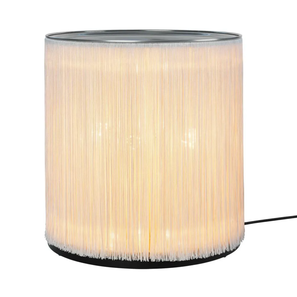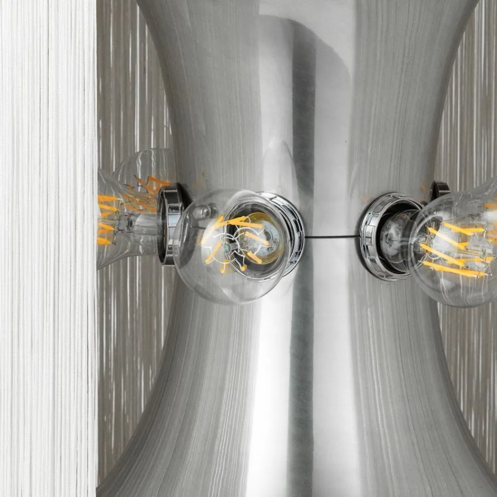 Schon beim ersten Blick auf die Model 597 Bodenleuchte fühlt sich der modebewusste Betrachter an die 1950er-Jahre erinnert, als Fransen modern waren. Auch die Schnurvorhänge in vielen italienischen Geschäften und Bars zur damaligen Zeit dienten Frattini als Inspiration. An dem zylinderförmigen Leuchtenschirm sind Fransen aus Nylon befestigt. Als Struktur dient ein Körper aus poliertem Aluminium. An der Oberseite ist der Metallkörper nach innen gewölbt. Die Model 597 Bodenleuchte braucht sieben Leuchtmittel mit E27-Fassung. Sie sind mittig am sanduhrförmigen Gestell montiert und sorgen hinter den Fransen für eine perfekte, blendfreie Zonenbeleuchtung.
