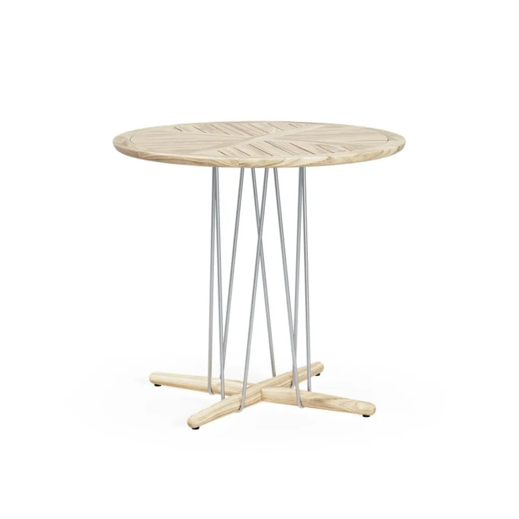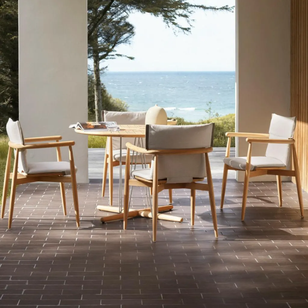 Inspiriert von der Ästhetik und dem Komfort der Indoor-Kollektion Embrace bringt dieser runde Esstisch eine harmonische Formensprache in den Außenbereich. Gefertigt aus FSC®-zertifiziertem, unbehandeltem Teakholz, entwickelt der Tisch mit der Zeit eine edle Patina, die seinen natürlichen Charme unterstreicht. Sein durchdachtes Design vereint eine feine Stahlrohrstruktur mit einer massiven Holzplatte und einem Sockel mit vier kreuzförmig angeordneten Holzleisten. Die Edelstahlstreben umrunden diese Holzleisten. So entsteht ein faszinierender Kontrast zwischen Leichtigkeit und Stabilität. Die Formsprache verleiht dem Tisch eine fast schwebende Anmutung – eine Anspielung auf das filigrane Gerüst eines Winddrachens. Die Tischplatte erinnert mit ihrer Zusammensetzung aus bis zu 50 Einzelteilen an die Blütenform einer Marguerite, was dem Tisch eine organische Eleganz verleiht. Dank seines runden Designs bietet der Embrace E022 Gartenesstisch viel Beinfreiheit und lädt zu geselligen Runden im Freien ein. Er ist in verschiedenen Größen erhältlich mit einem Durchmesser von 80 cm, 110 cm oder 140 cm und passt perfekt zum Embrace E008 Gartenarmlehnstuhl. Zusammen entsteht ein einladendes Ensemble für stilvolle Mahlzeiten unter freiem Himmel.