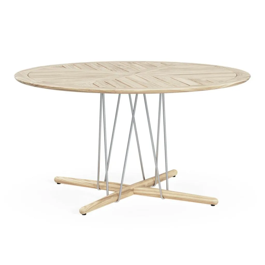 Ein Gartentisch, der massives Holz mit einem filigranen Gestell zu kombinieren vermag: Der Embrace E022 Gartenesstisch von Carl Hansen ist ein Hingucker für den Außenbereich.