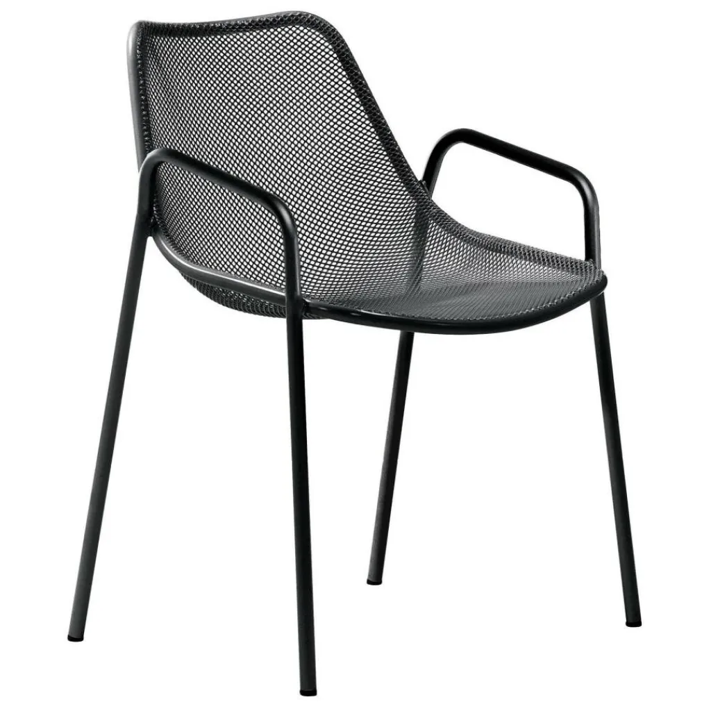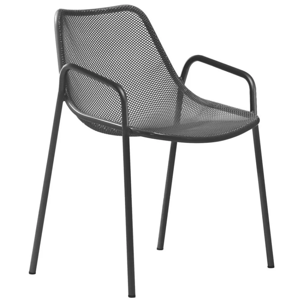 Das Design basiert auf der Idee, den Wert des Materials hervorzuheben und damit prominent ins Rampenlicht zu rücken. Kombiniert mit technischen Innovationen im Entstehungsprozess, bei der das Metall zwischen zwei Stahlelementen zusammengezogen wird, entsteht die dreidimensionale Form des Stuhls. Das Rahmengestell besteht aus Stahlrohr und die Sitzschale aus Streckmetall, das in einem Arbeitsschritt gestanzt und geformt wird. Round überzeugt auch durch seine praktischen Aspekte: Der Stuhl ist bis zu 8 Stühlen stapelbar und auch für den Außenbereich bestens geeignet.