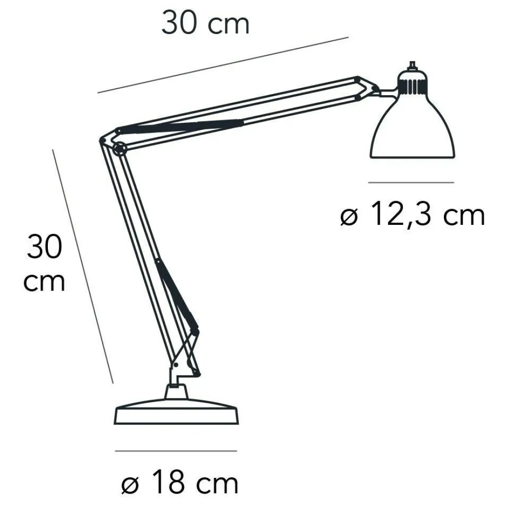 Die 30 cm im Durchmesser messende Lampe für den Schreibtisch besitzt drei praktische, technisch ausgefeilte Gelenke, durch die sie in sämtliche Positionen gebracht, geschwenkt oder gestaucht werden kann. Die aus Aluminium gefertigte Lampe ist mit einem stabilen Tischfuß oder mit einer funktionellen Tischklemme erhältlich, die Ihre Bedürfnisse optimal befriedigen werden.