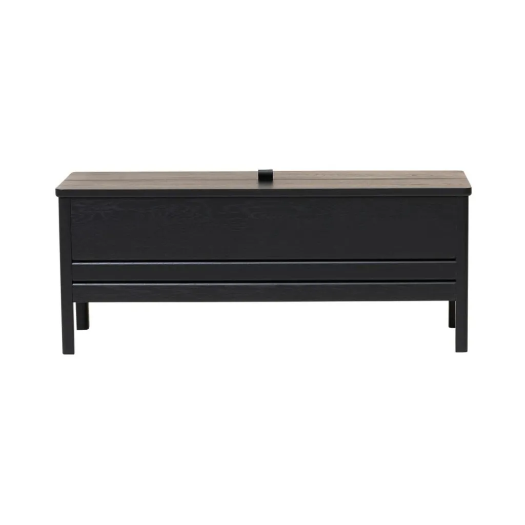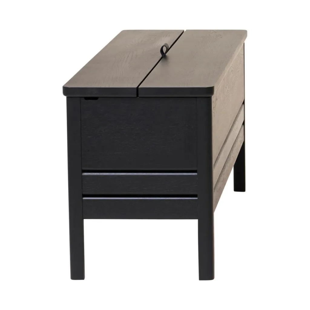 Die A Line Truhenbank 111cm ist eine nachhaltige Wahl: Die Designer aus Dänemark wählen bewusst regionale Rohstoffe. Sie stellen die Truhenbank aus edlem Eichenholz her. Es gibt die A Line Truhenbank 111cm in verschiedenen Farbtönen. An der Oberseite der Truhenbank ist eine kleine Lasche aus Leder zu sehen. Sie dient dazu, das Möbelstück zu öffnen. So wird der Blick auf den großen Stauraum im Inneren der Bank frei. Hier können Spielsachen, Kleidung und viele weiteren Utensilien ordentlich verstaut werden. Noch dazu ist die A Line Truhenbank 111cm eine bequeme Sitzgelegenheit, die sich vielseitig einsetzen lässt. Sie ist mit bis zu 250 kg belastbar und bietet Platz für drei Personen. Vom Stil her ist die A Line Truhenbank 111cm minimalistisch gehalten.