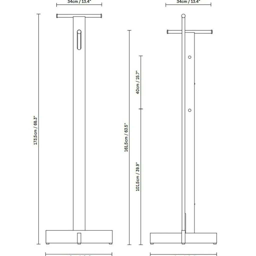 Der Foyer Kleiderständer ist 173,5cm hoch. Vorrichtungen zum Aufhängen von Kleidern befinden sich in Höhen von 161,5cm, 141,5cm oder 101,5cm. Der Fuß misst 50cm in der Breite. Das Designstück wiegt 5,1kg. Es ist in Ausführungen mit verschiedenartig behandelten Oberflächen erhältlich.