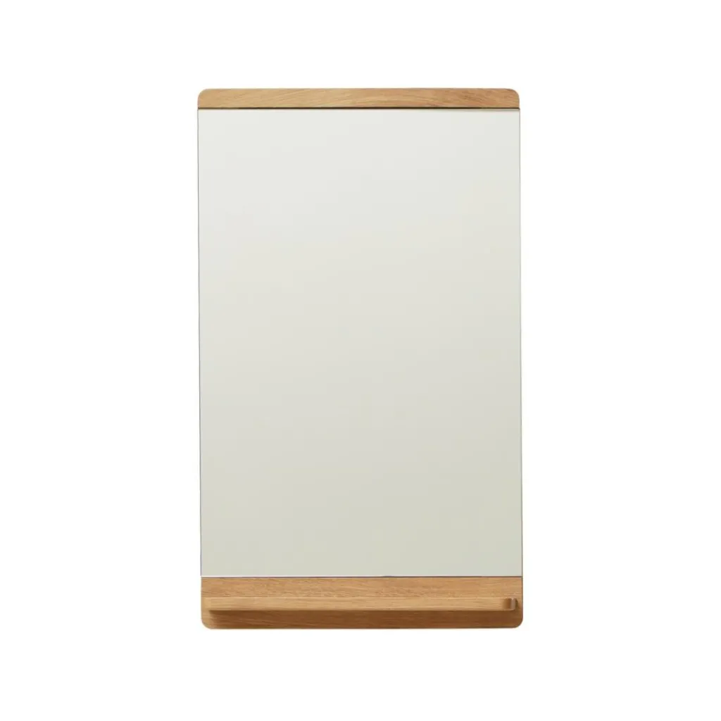 Beim Rim Wandspiegel handelt es sich um eine nachhaltige Wahl. Die Holzelemente stammen aus nachhaltiger Forstwirtschaft. Sie tragen daher das FSC®-Siegel. An der Ober- und Unterseite ist der Spiegel mit flachen Holzplatten eingerahmt. Sie verleihen dem Zimmer ein wohnliches Flair, da die natürliche Maserung zu sehen ist. Da an der Rückseite des Spiegels dickere Holzleisten angebracht sind, hebt sich der Rim Wandspiegel ein wenig von der Wand ab. So entsteht ein interessantes Spiel von Licht und Schatten. An der unteren Seite ist eine schmale Ablage angebracht. Hier sind Schminkutensilien, Schlüssel und andere Gegenstände griffbereit aufbewahrt.