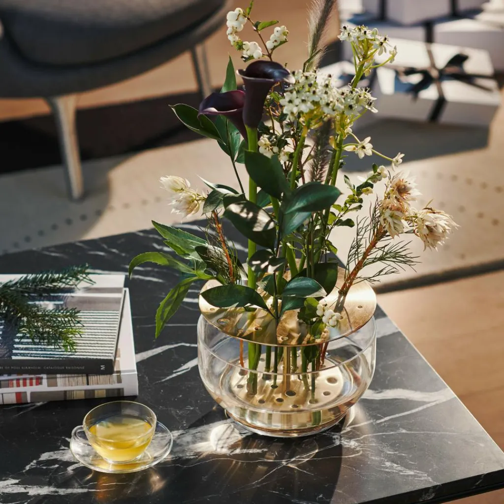 Mit der Ikebana Vase L hat Jaime HAYon ein ebenso formschönes wie funktionales Wohnaccessoire geschaffen. Die Kombination aus dem fragil wirkenden Glaskörper und den glänzenden Messingelementen ergibt ein optimales Umfeld für kunstvolle Blumenarrangements. Auch zarte Blumenstengel finden in dem metallenen Grundelement einen sicheren Stand. Die obere Messingscheibe erlaubt es, die einzelnen Elemente individuell und dekorativ anzuordnen. Die ausgewogenen Proportionen des mundgeblasenen Glaskörpers machen die Ikebana Vase L zu einem attraktiven Dekoelement auf Tischen und Sideboards.