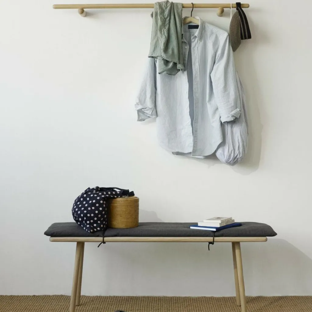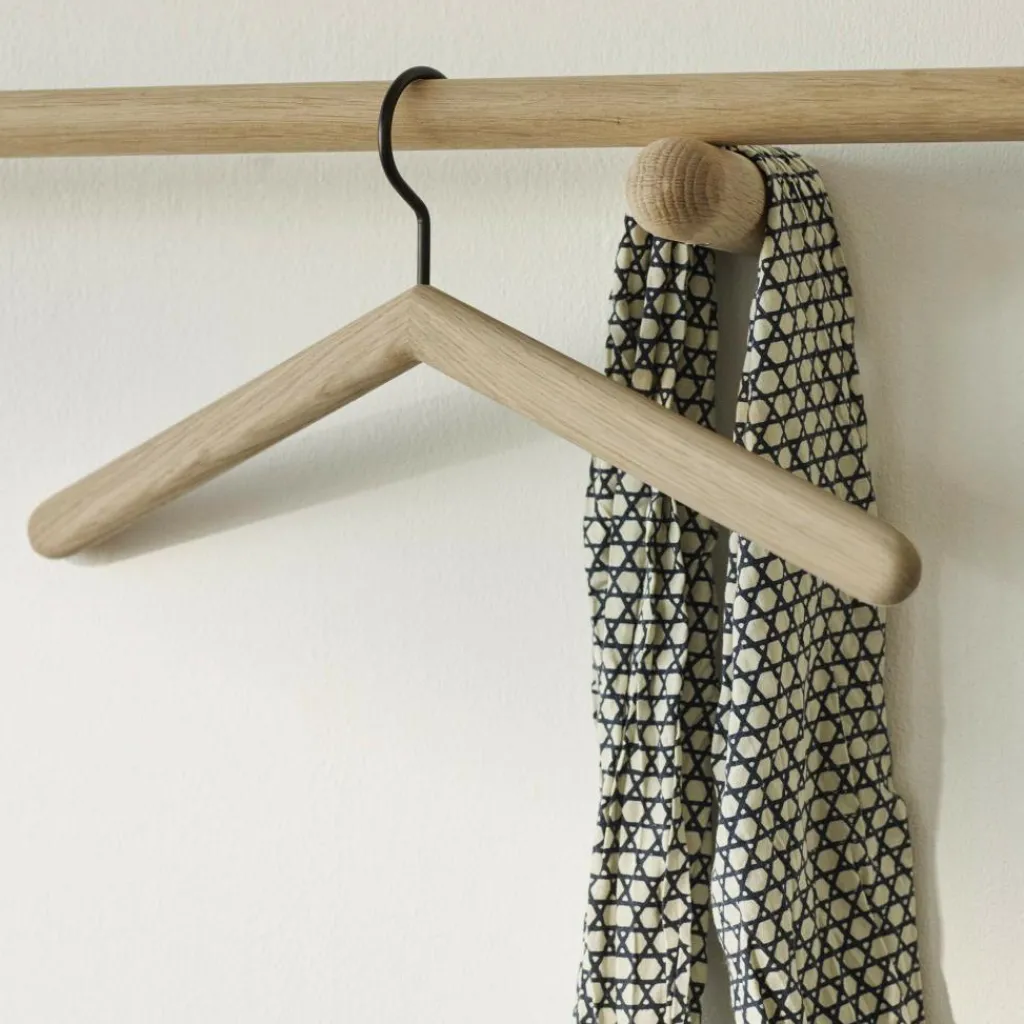 Die Skagerak Georg Garderobenleiste verkörpert mit ihrer klaren, schlichten Linienführung und zeitlosen Eleganz eindeutig dänisches Design. Die Holzleiste passt hervorragend in die Diele und bewahrt selbst in schmalen Eingangsbereichen Jacken und Mäntel auf. Die Garderobenleiste besteht aus massiver, 100 % FSC®-zertifizierter Eiche, die entweder natürlich ungeölt oder schwarz lackiert ist. Ein runder Querbalken liegt auf zwei kleinen, ebenfalls runden Balken auf, die an der Wand befestigt werden. Die schwebende Optik macht die schlichte Skagerak Georg Garderobenleiste zu einem raffinierten Wohnaccessoire, das nebenbei noch überaus praktisch in ihrer Funktion als Kleidungsaufbewahrungslösung ist. Das warme Eichenholz verstärkt den wohnlichen Charakter der Garderobe, die 115 cm lang ist. Ihre Tiefe ist 15 cm, während ihre Höhe 6,5 cm misst. Fritz Hansen schafft Designer-Möbel, die Generationen überdauern und moderne Nachhaltigkeit als Standard fürs Zu Hause setzen. Daher ist auch die 0,85 kg leichte Skagerak Georg Garderobenleiste aus massiver Eiche in Design und Material besonders langlebig und zeitlos schön gestaltet.