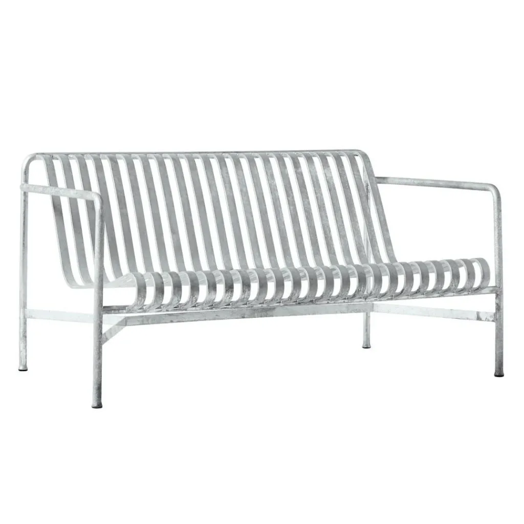 Die Palissade-Kollektion fügt sich elegant in jeden Garten, jede Terrasse oder den Balkon ein. Charakteristisch sind neben den glänzenden Lamellen auch robuste Rahmen, die aus runden Stahlrohren gebildet werden. Sie enden in vier Füßen, die dem Modell perfekte Standfestigkeit sichern. Beim Palissade Outdoor Lounge Sofa Feuerverzinkt bieten die zwei seitlich montierten Armlehnen zusätzlichen Komfort. Das hochwertige Outdoormöbel ist 139 cm lang, 70 cm hoch und 88 cm tief. Die Sitzhöhe beträgt 38 cm.