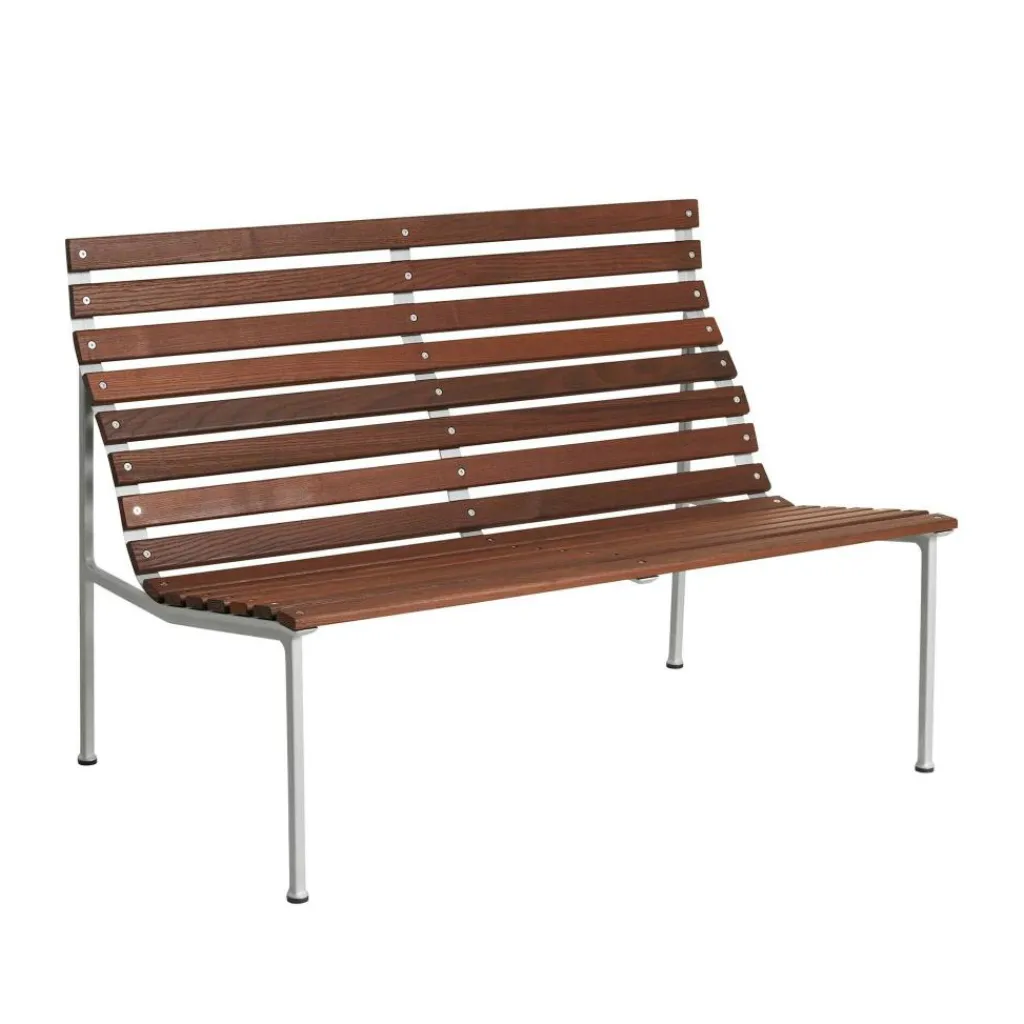 Mit einer Breite von 114 cm bietet sie komfortabel Platz für zwei Personen, die sich zurücklehnen und die Ruhe im Garten, auf der Terrasse oder dem Balkon genießen möchten. Ihre niedrige Sitzhöhe von 36,5 cm und die geneigte Rückenlehne laden zum entspannten Verweilen ein, während die großzügige Tiefe von 70,5 cm ausreichend Raum für eine entspannte Sitzhaltung lässt. Gestaltet von Erwan Bouroullec, fügt sich die Traverse Lounge Gartenbank nahtlos in die Traverse-Kollektion ein – und doch besitzt sie durch ihre Proportionen und die klare Linienführung eine ganz eigene Präsenz. Sitz- und Rückenflächen bestehen aus massivem, thermisch behandeltem Eschenholz, das ausschließlich mit natürlicher Hitze und Dampf bearbeitet wurde. Dieses Verfahren sorgt für außergewöhnliche Langlebigkeit, Schutz vor Witterungseinflüssen und eine warme, dunkle Holzfärbung, die mit der Zeit in ein silbriges Grau übergeht. Diese natürliche Patina verleiht der Bank eine authentische Ausstrahlung, die mit jeder Saison an Tiefe gewinnt. Das tragende Gestell aus Druckguss-Aluminium verbindet filigrane Optik mit hoher Stabilität. Es besteht zu großen Teilen aus recyceltem Material, ist kugelgestrahlt und mit einem klaren Outdoor-Lack versiegelt, der das Metall vor Korrosion schützt, ohne seine raue Struktur zu verbergen. Trotz ihrer Robustheit bleibt die Bank mit 15,9 kg vergleichsweise leicht und flexibel in der Platzierung. Auch in puncto Nachhaltigkeit überzeugt die Traverse Lounge Gartenbank: Das verwendete Holz stammt aus FSC®-zertifizierter Forstwirtschaft, die Aluminiumkomponenten sind zu einem Großteil wiederverwertbar. Pflegeleicht ist sie zudem – regelmäßiges Ölen hält die Holzoberfläche geschmeidig und schützt vor oberflächlichen kleinen Spannungsrissen durch wechselnde Luftfeuchtigkeit. Diese natürlichen Veränderungen beeinträchtigen die Struktur nicht und sind Ausdruck der Echtheit des Materials.