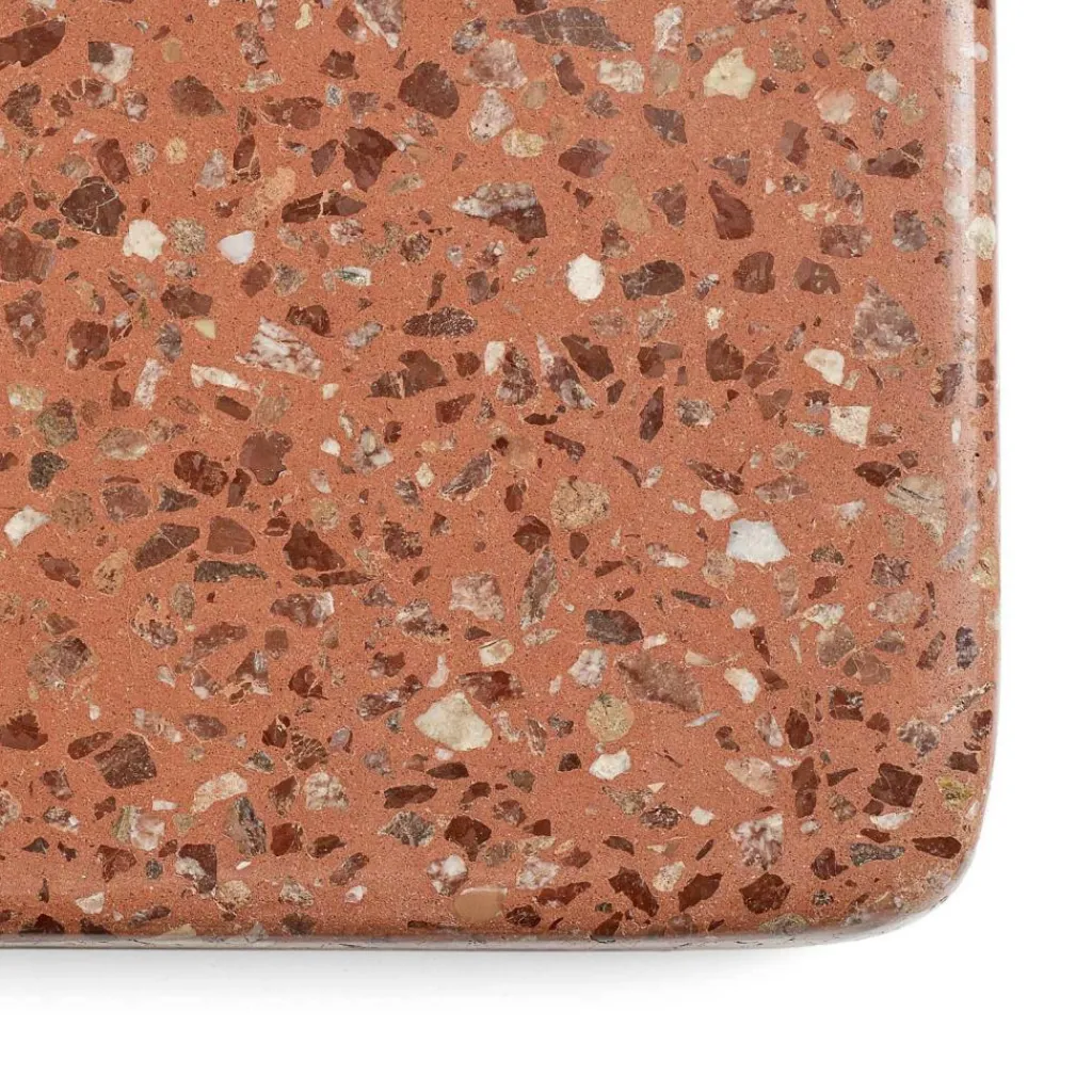 Die Oberfläche des Terrazzo Gartentischs besteht aus elektro-galvanisiertem Stahl, der mit einem Pulver beschichtet ist. Das schlichte und funktionale Top überzeugt mit einem farbenfrohen und verspielten Terrazzo. Dieser Rohstoff hat die Qualität von Beton. Im Gegensatz dazu hat Terrazzo aber eine fantastische und expressive Oberfläche, die jede Aufmerksamkeit auf sich zieht. Die überragenden Eigenschaften von Terrazzo wie seine Robustheit haben sich beim Bau von U-Bahn-Stationen bewährt und machen den Baustoff wegen seiner Stabilität und Frost-Resistenz zu einer optimalen Grundlage für Outdoor-Möbel.