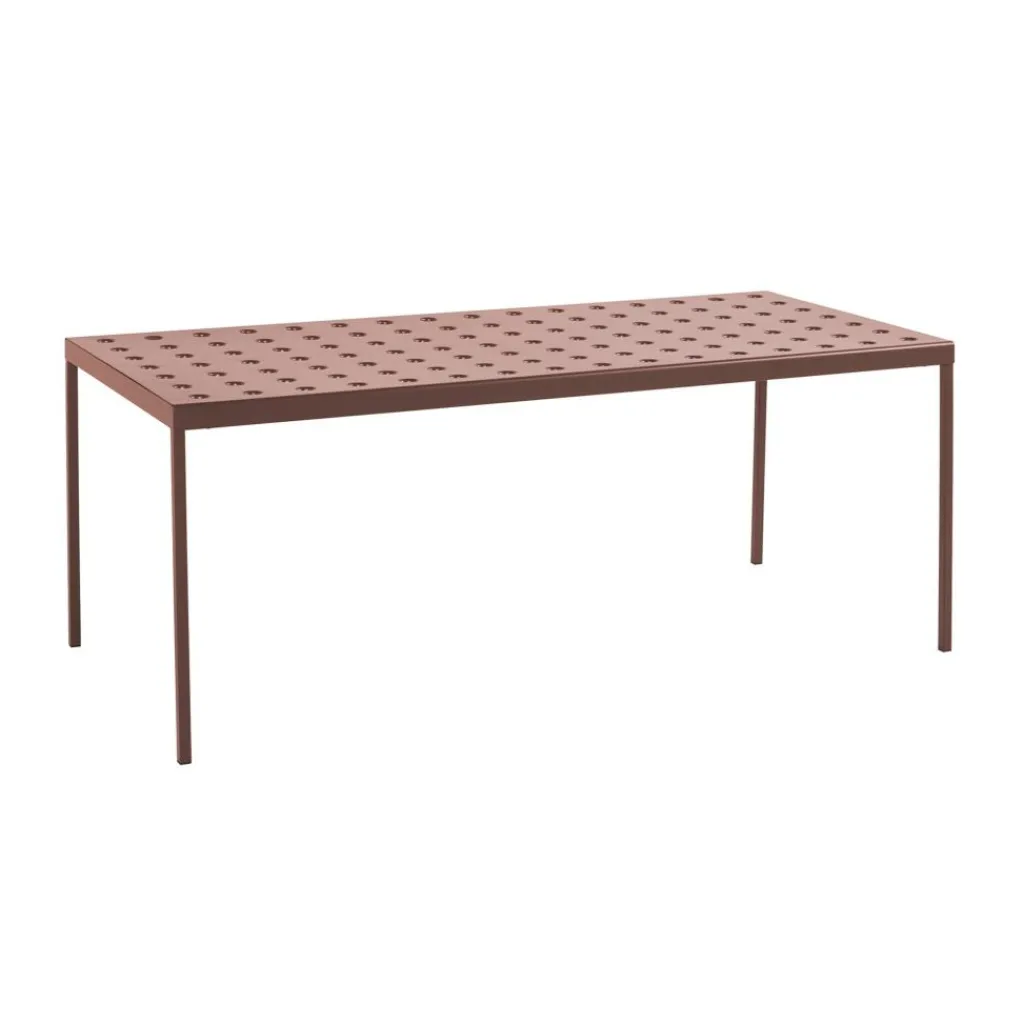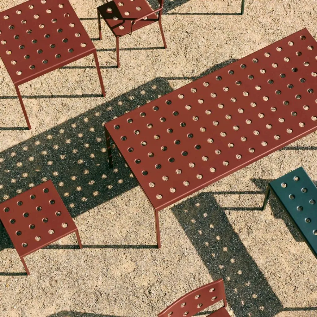Als Erweiterung der beliebten Balcony-Serie, die auch Stühle und Bänke umfasst, brachten die Brüder Bouroullec den Balcony Gartentisch 190x87x74cm auf den Markt. Sein Markenzeichen sind die zahlreichen Löcher, die in einem strengen geometrischen Muster in die Tischplatte eingearbeitet sind. Durch sie kann Regenwasser rasch abfließen. Außerdem lässt sich die pflegeleichte Oberfläche mit einem weichen Tuch reinigen. Hergestellt wird der Balcony Gartentisch 190x87x74cm aus pulverbeschichtetem Stahl. Zahlreiche Farben stehen zur Auswahl. Das Design des Balcony Gartentischs 190x87x74cm beschränkt sich auf ein Minimum: Die vier Beine aus Stahlrohr sind gerade geschnitten. An der Unterseite sind Gleiter montiert. Die Tischplatte ist rechteckig geformt.