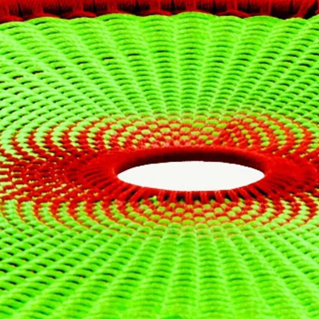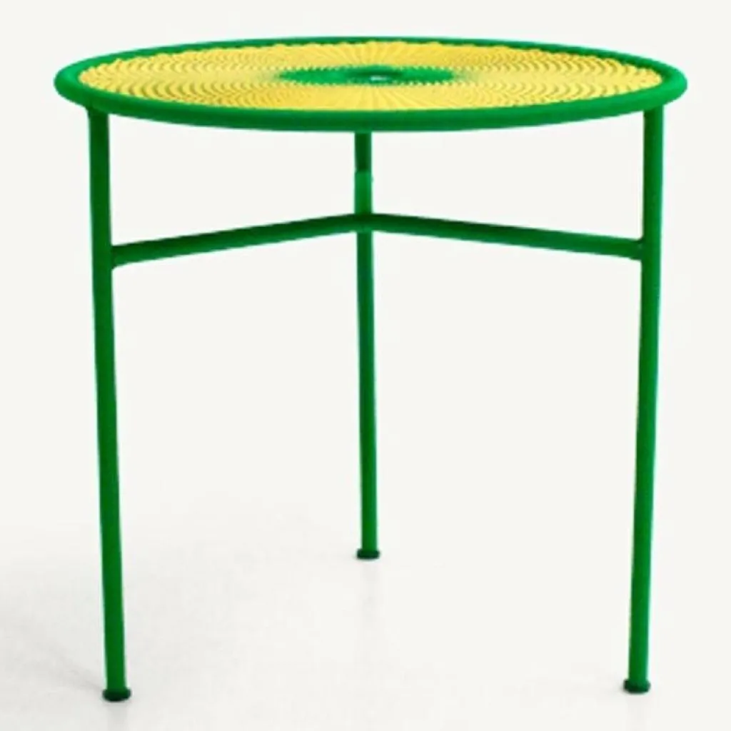 Der Banjooli Bistrotisch strahlt Lebensfreude und Wärme aus. Er ist in den Varianten gelb und grün beziehungsweise hellgrün und rot verfügbar. Die runde Fläche hat einen Durchmesser von 75 cm und eine Höhe von 72 cm. Die geflochtenen Muster und die zwei Farbkreise, die ineinander übergehen, erinnern an das Federkleid eines tropischen Vogels. Die drei Beine aus Stahl sind je nach Modell entweder in kräftigem Rot oder in leuchtendem Grün lackiert. Die Fußgleiter bestehen aus PVC.