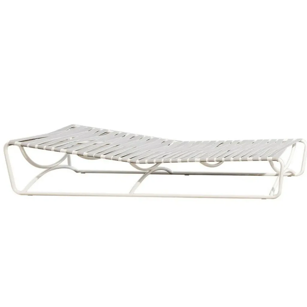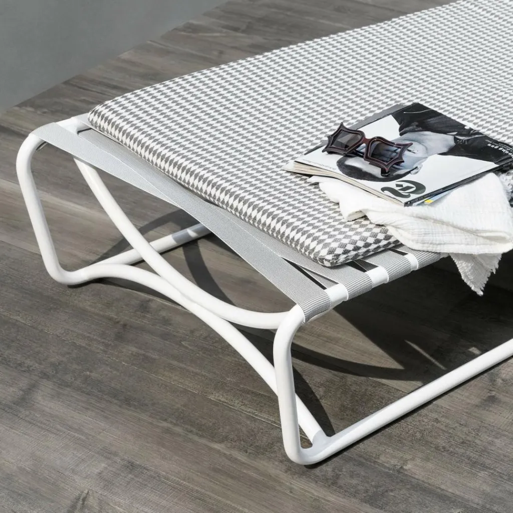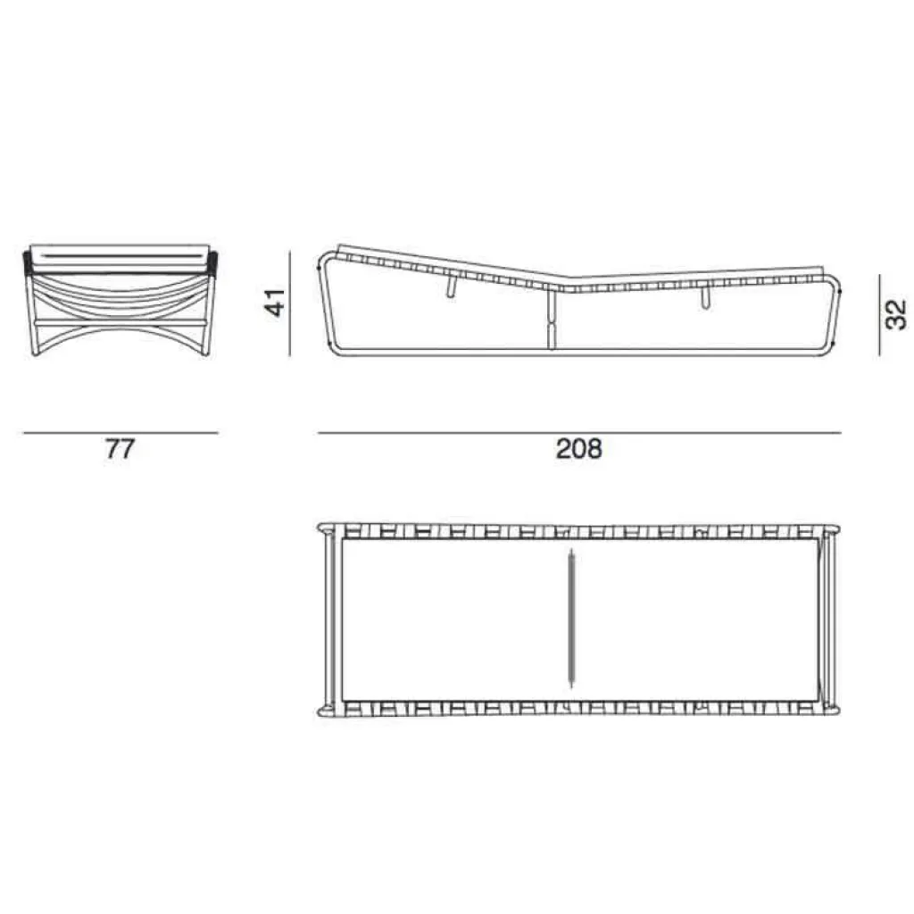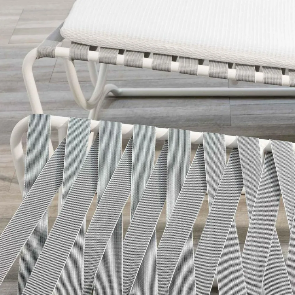 Dezent fügt die Liege mit den Maßen 208 x 77 cm und einer Sitzhöhe von 32cm sich in ihre Umgebung ein und ist dennoch ein Hingucker durch die besondere Kombination der Materialien. So besteht die Sitz- beziehungsweise Liegefläche nicht aus einem herkömmlichen Flechtmaterial, sondern aus Gurten, die einander kreuzen und dadurch eine besonders bequeme Oberfläche bilden, die sich dem Körper anpasst. Im Kontrast zu dem Gurtgeflecht steht das Gestell, welches aus Aluminiumrohr gestaltet wurde und an Industriedesign erinnert, durch die geschwungen Linien jedoch gleichermaßen an organische Formen angelehnt ist.