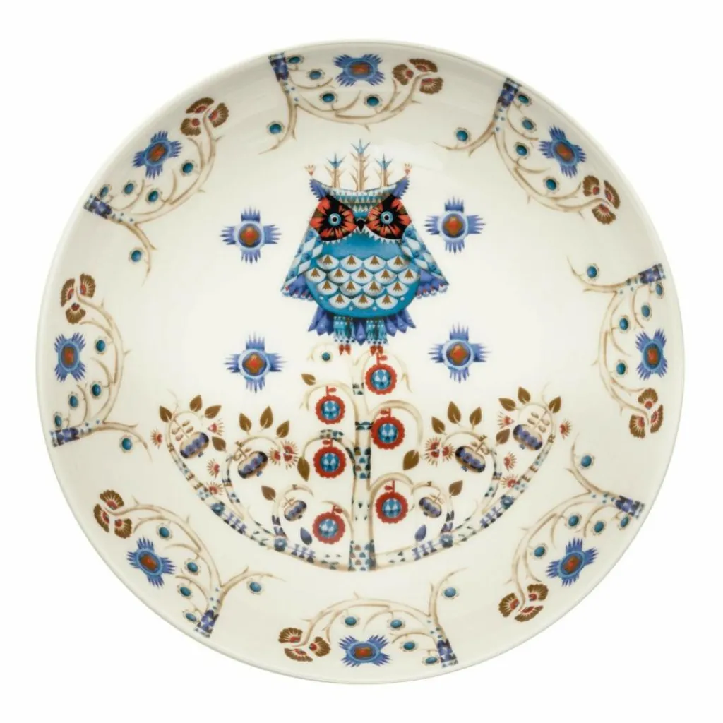 Der Taika Teller tief Ø20cm ist schlicht und gerade auslaufend geformt und hat eine angenehme Materialstärke. Er wird aus dem hochwertigen Material Vitro-Porzellan hergestellt und zeigt auf seinem jeweils weißen Grund eine großflächig angelegte Illustration der typischen Eule aus der Taika-Kollektion. Zudem wird auf einigen Ausführungen der Rand mit Ornamenten in Form eines rund gebogenen Astes mit Blüten und Knospen dekoriert.