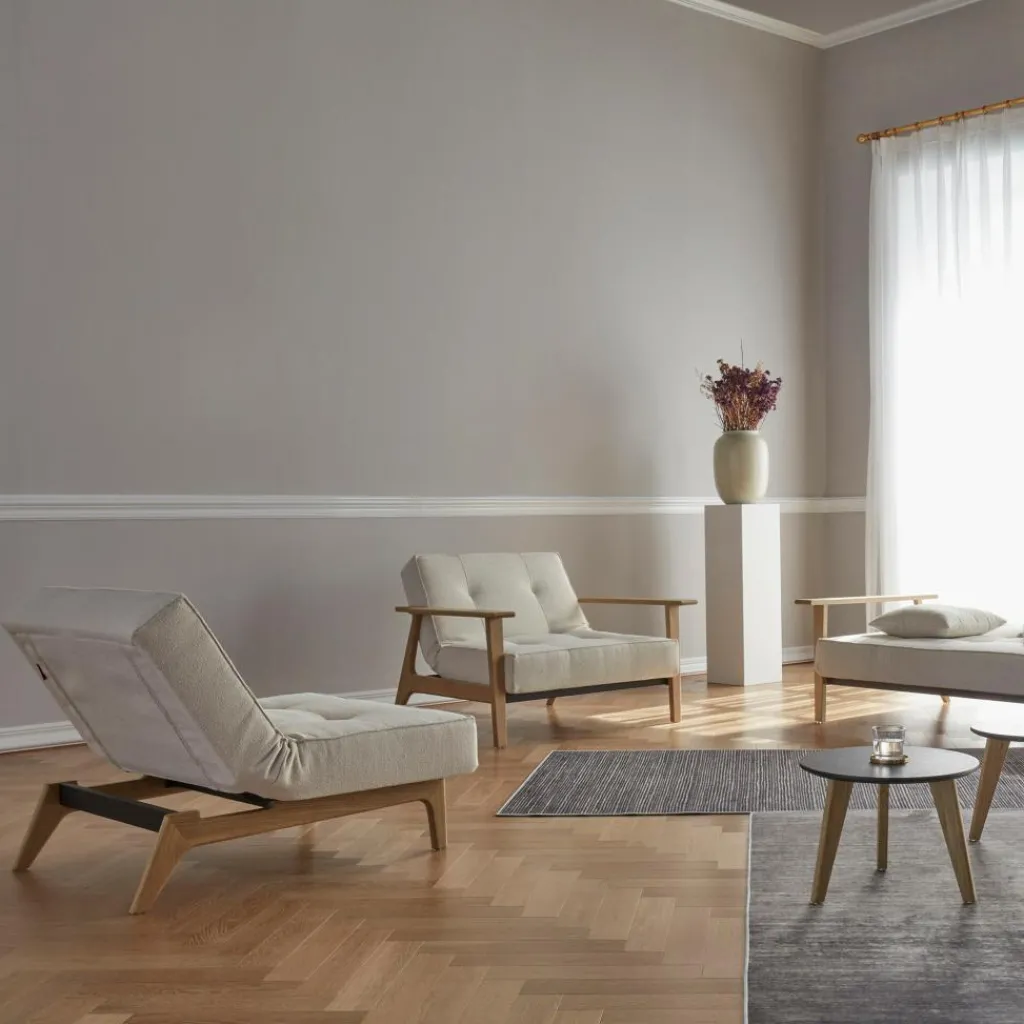 Der Splitback Sessel Eiche wurde von Per Weiss und Oliver Weiss-Krogh für die Marke Innovation Living entworfen. Während sich das dänische Label zu Beginn der 70er-Jahre der Fertigung von gemütlichen Sitzsäcken widmete, eroberte es 1989 mit der Präsentation seiner eleganten Schlafsofas die Herzen von stilaffinen Stadtbewohnern.
