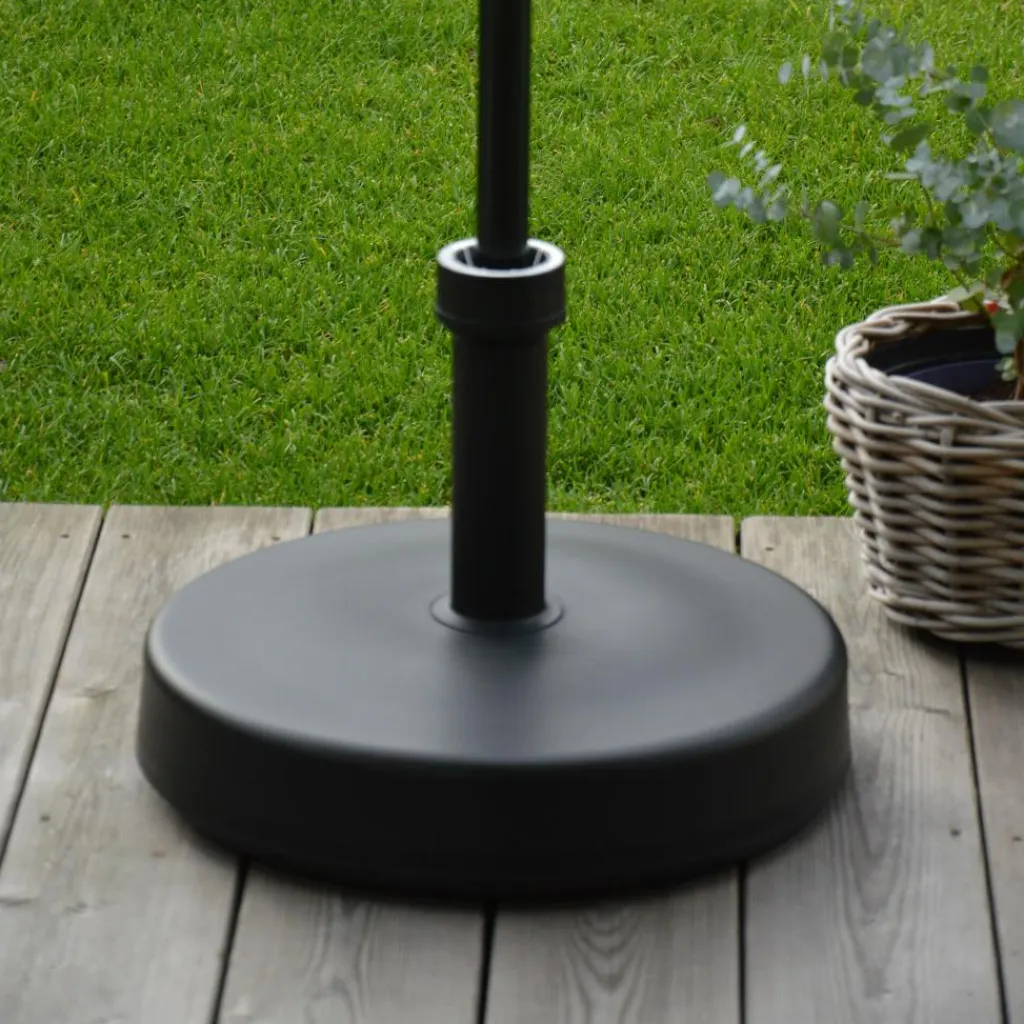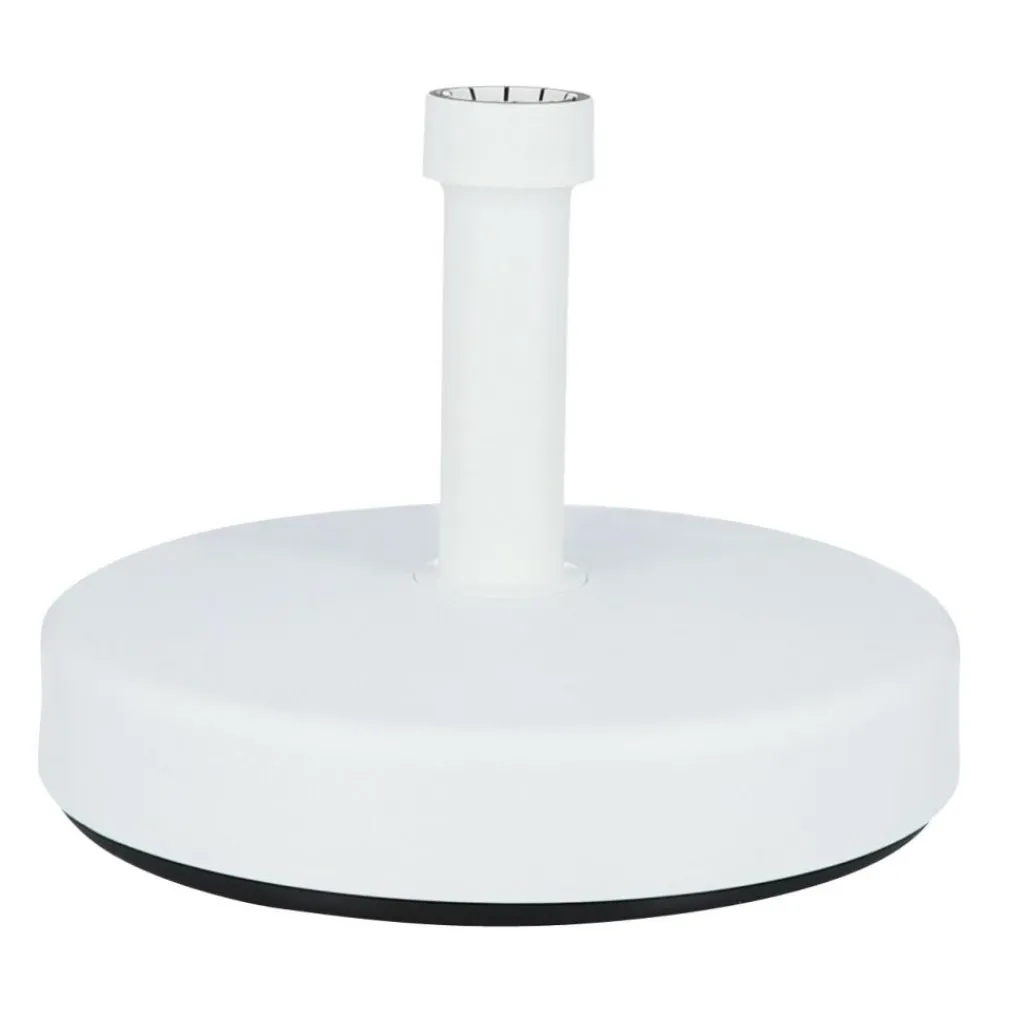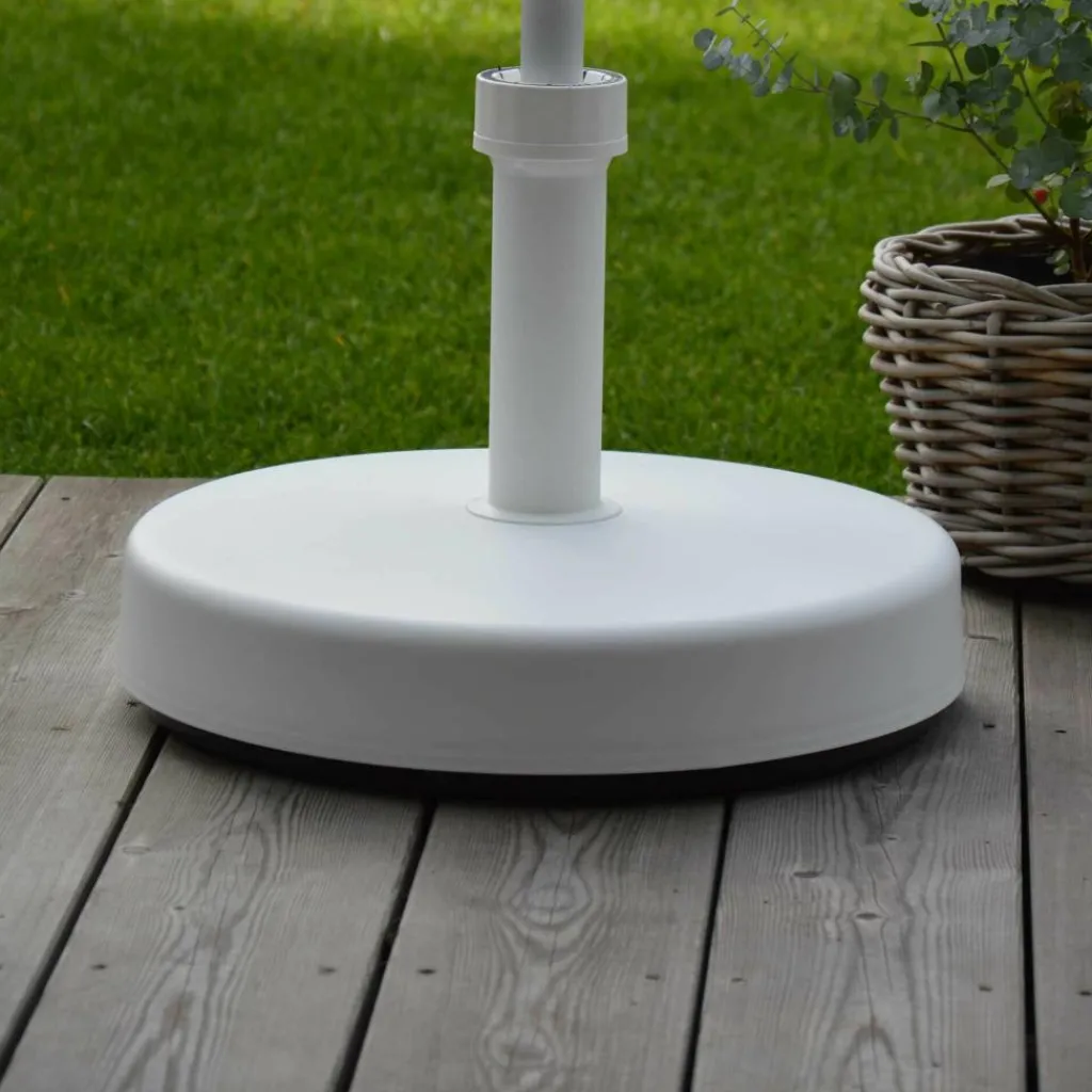 Der schlichte Schirmständer ist aus Kunststoff gefertigt und bietet mit seiner Stabilität die ideale Basis für einen Schatten spendenden Sonnenschirm mit einem Stockmaß von 2,1 bis 5,4 cm. Unauffällig in weiß oder schwarz fügt sich der Sand Schirmständer Kunststoff dezent in die Einrichtung auf der Terrasse oder den Balkon ein und fällt nicht weiter auf. Ein Durchmesser von 46 cm und eine Höhe von 35 cm machen den Schirmständer zu einem standfesten und robusten Accessoire, das vor allem nützlich ist. Mit einem Gewicht von 1,8 kg ist leicht und verstellbar. Die Hülse misst circa 24 cm und die Bodenplatte ist circa 11 cm hoch. Vor dem Einsatz als Schirmständer sollten Sand oder Kieselsteine in den Ständer gefüllt werden – so ist er zwar nicht mehr ganz so flexibel umstellbar, aber standfest auch bei Wetterumschwüngen.