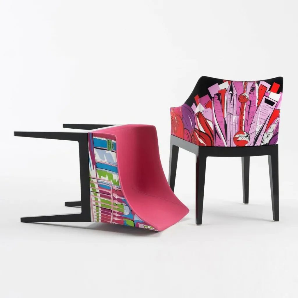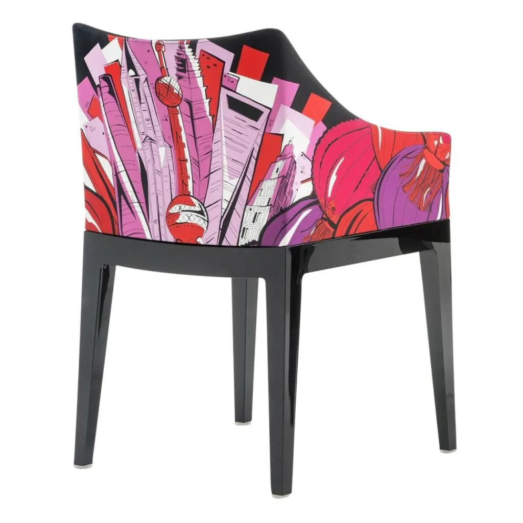 Der Madame Pucci Armlehnstuhl wurde von Philippe Starck für die Marke Kartell entworfen. Die farbenfrohen Sitzgelegenheiten gehören zur Kollektion Cities of the World, die den Betrachter auf eine Reise um die ganze Welt einladen.