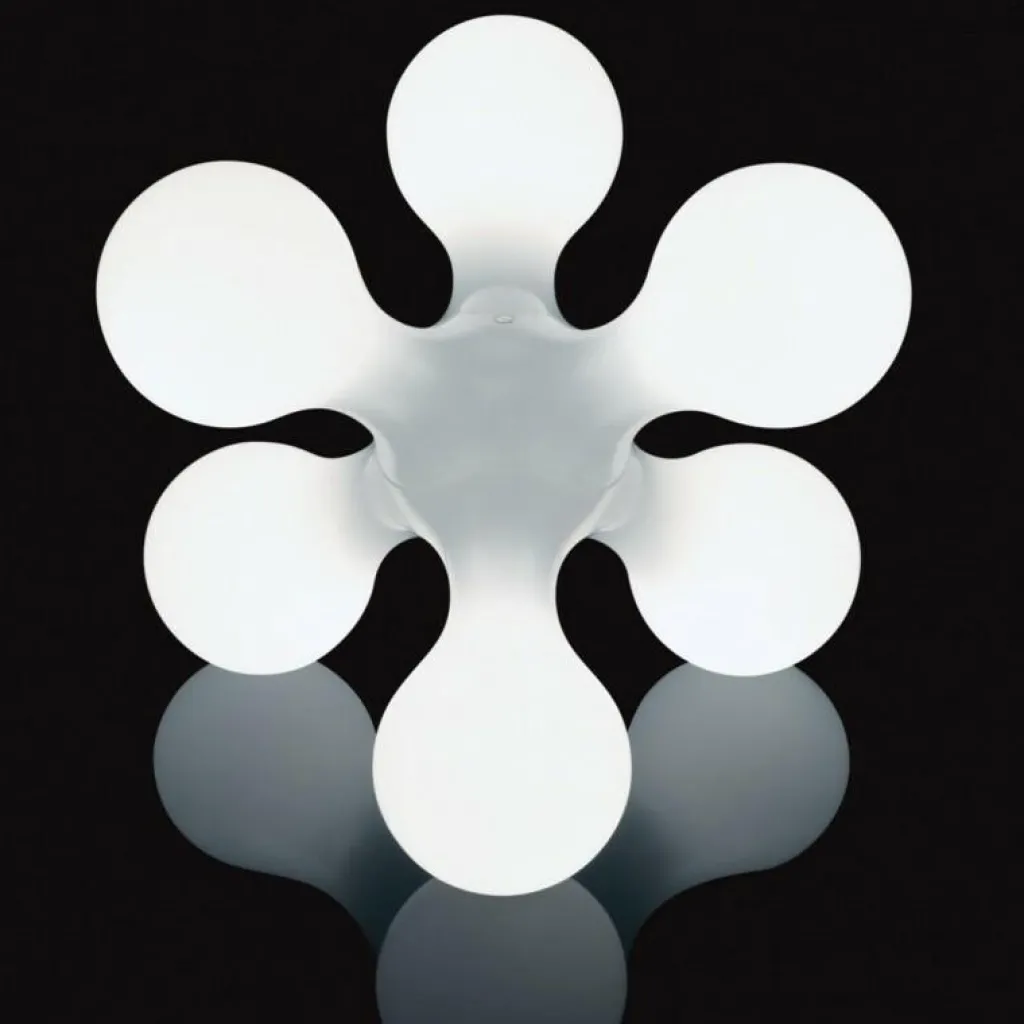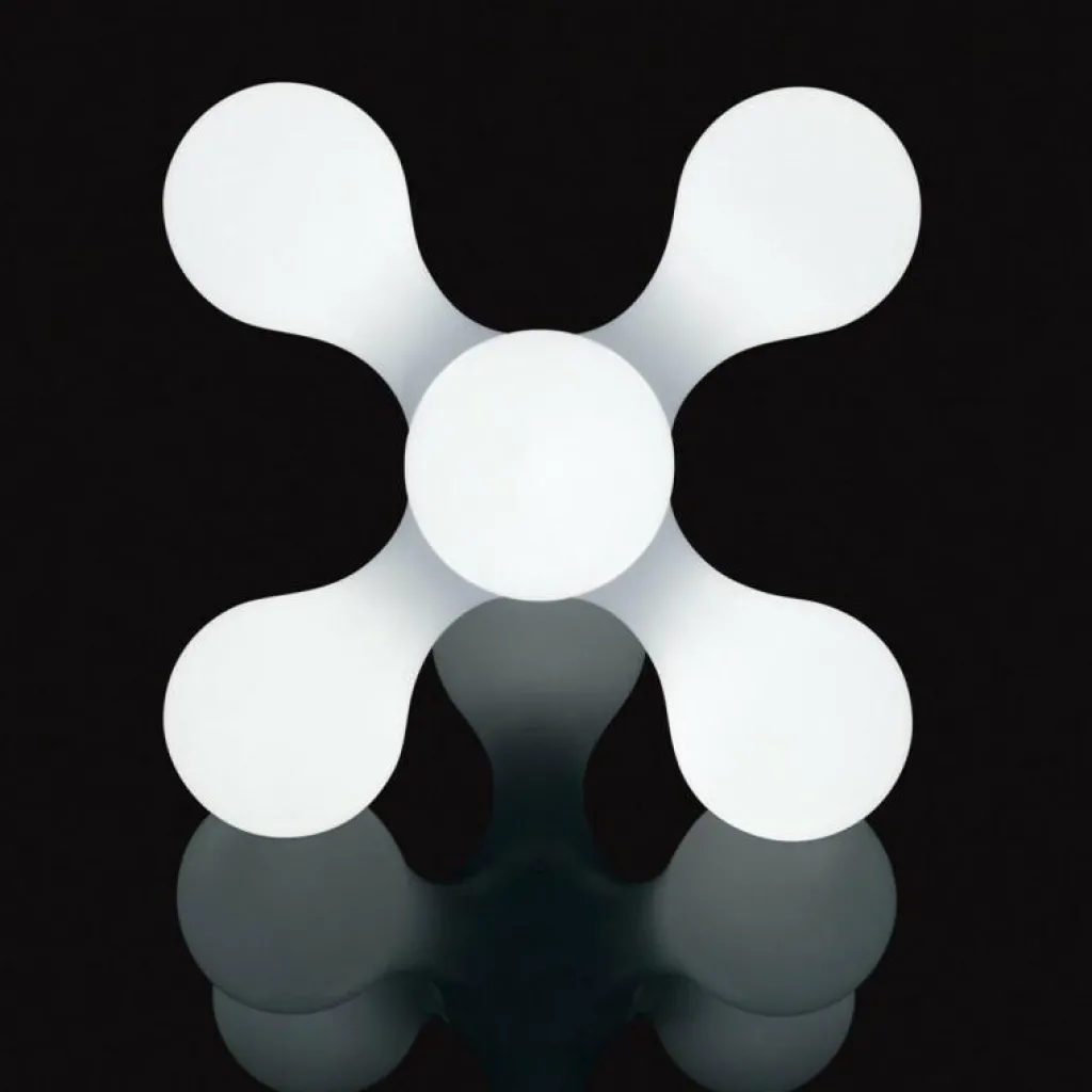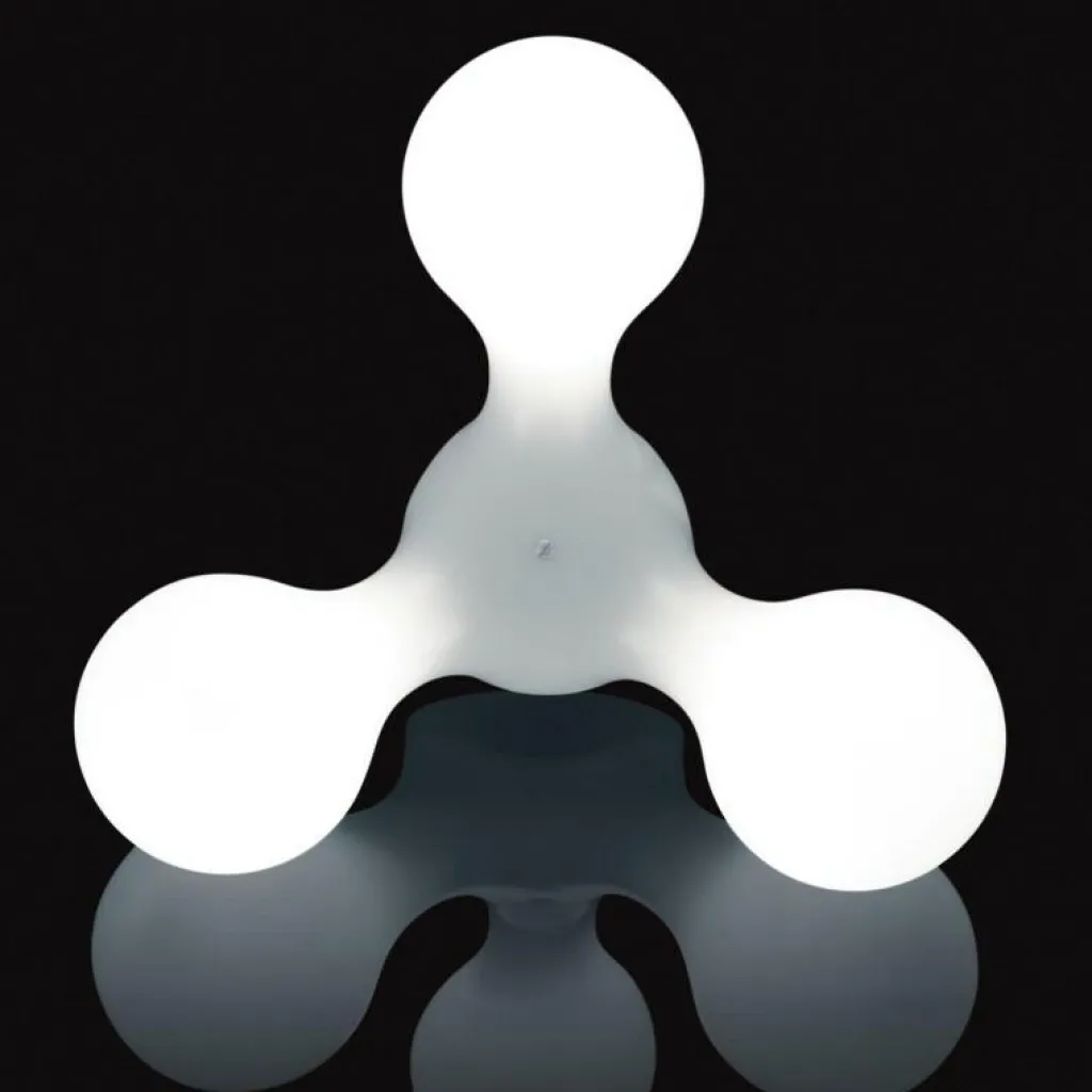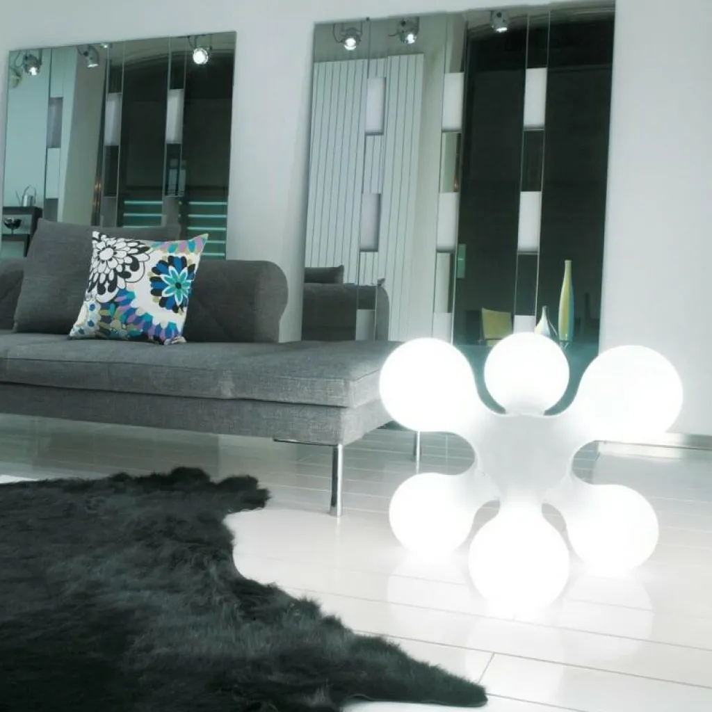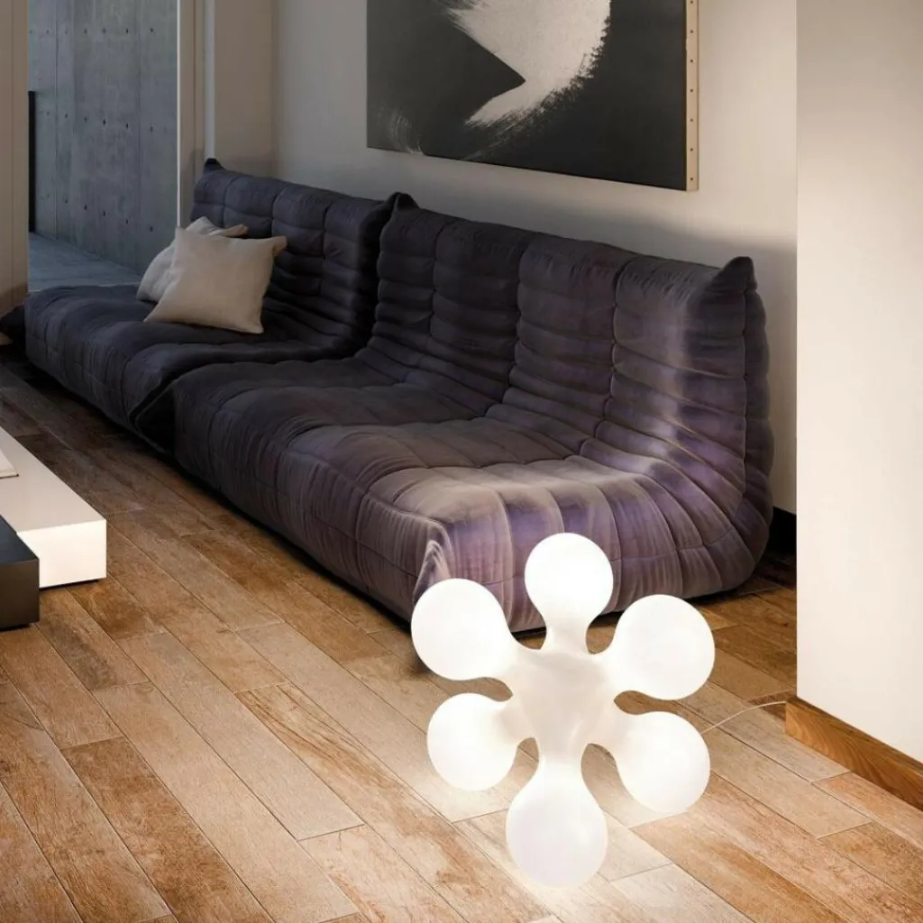 Die Idee hinter dem Atomium in der belgischen Hauptstadt war, die Atome von Eisen nachzubilden. Die Atomium Bodenleuchte/Tischleuchte besteht ähnlich aus 6 Kugeln, die miteinander verbunden sind. Sie sind aus robustem Technopolymer hergestellt, das mittels Rotationsgussverfahren seine markante Form erhält. Mit drei der Lichtarme hat die Leuchte Bodenkontakt. Im Inneren verbirgt sich eine Federstruktur aus Stahl. Auch wenn die Atomium Bodenleuchte/Tischleuchte gerade nicht in Verwendung ist, wird sie zum Blickfang. Sie schmückt Kommoden, Tische oder kann einfach auf dem Boden platziert werden. Eingesetzt wird die Atomium Bodenleuchte/Tischleuchte zum Beispiel in privaten Wohnräumen, in Büros und Boutiquehotels.