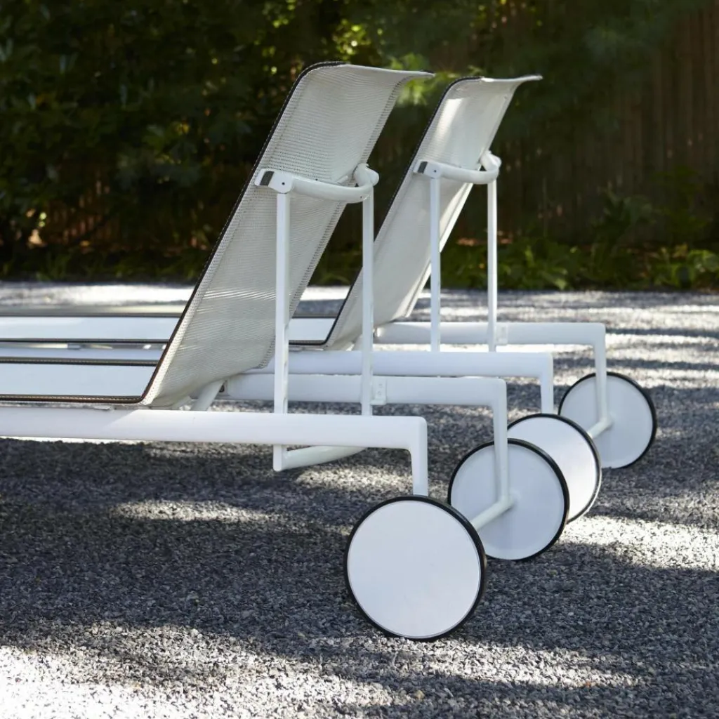 Die weiße Sonnenliege besticht durch ihr architektonisch klares, urbanes Design. Die verstellbare Rückenlehne ermöglicht Ihnen, je nach Bedarf bequem zu sitzen oder zu liegen. Die elegante 1966-42 Richard Schultz Sonnenliege passt besonders gut auf die Terrasse oder in den Poolbereich. Gerade im Schwimmbeckenbereich braucht man sich mit dieser Liege vor Wasserspritzern oder Feuchtigkeit nicht zu fürchten. Die widerstandsfähige Sonnenliege ist dafür wie geschaffen. Egal, welche Farben und Muster Ihre Auflagen, Sonnenschirme oder sonstigen Accessoires haben, die weiße Farbgebung der Liege passt sich allem mühelos an. Die Rollen am Fußende der Liege sind nicht nur dekorativ, sondern auch praktisch. So lässt sich die Liege mühelos von einem zum anderen Ort rollen, zum Beispiel, wenn der Stand der Sonne sich verändert hat.