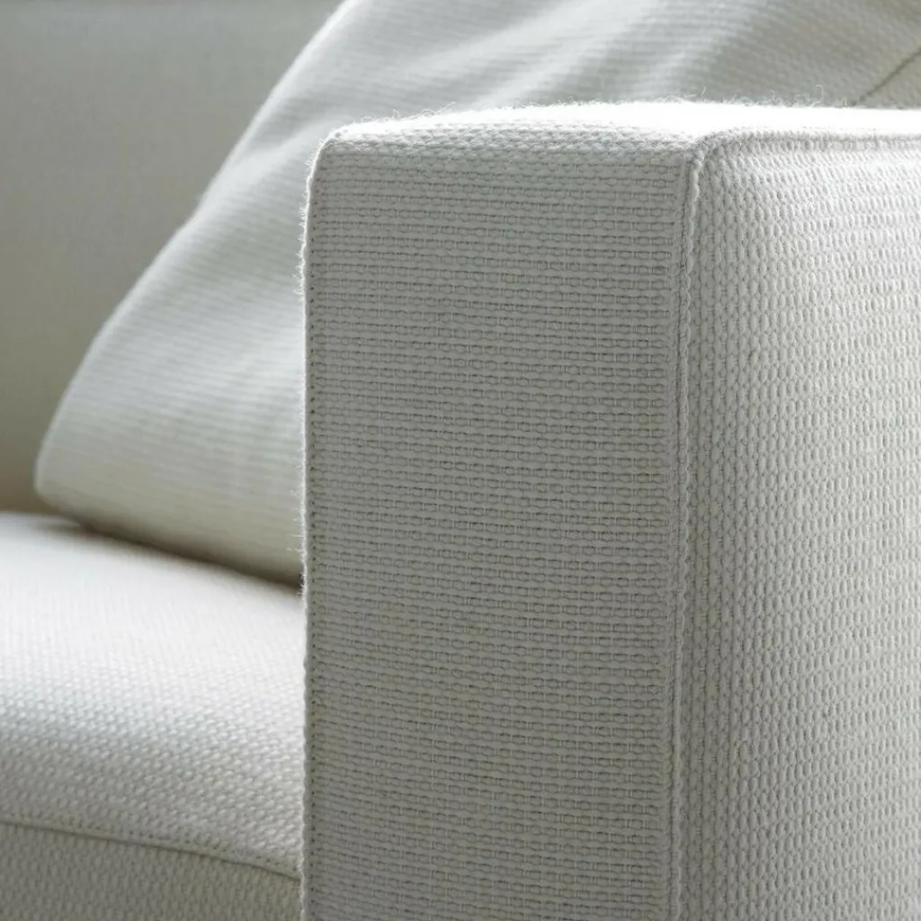 Als bewährtes Ausgangsmaterial für das Grundgestell dient massives Holz in stabiler Ausführung. Umschlossen wird das Ganze von einer angenehm weichen Polsterung. Diese erhält einen stilvollen Bezug aus textilem Gewebe. Auffällig erscheint dabei die leicht erhabene Optik, die sich wie eine Art geflochtenes, verwobenes Muster zeigt. Die rund geformten Möbelfüße am Barber & Osgerby 2-Sitzer Sofa bestehen aus hochwertigem Aluminium, dessen Oberflächen mithilfe einer sorgfältigen Pulverbeschichtung farblich veredelt werden.