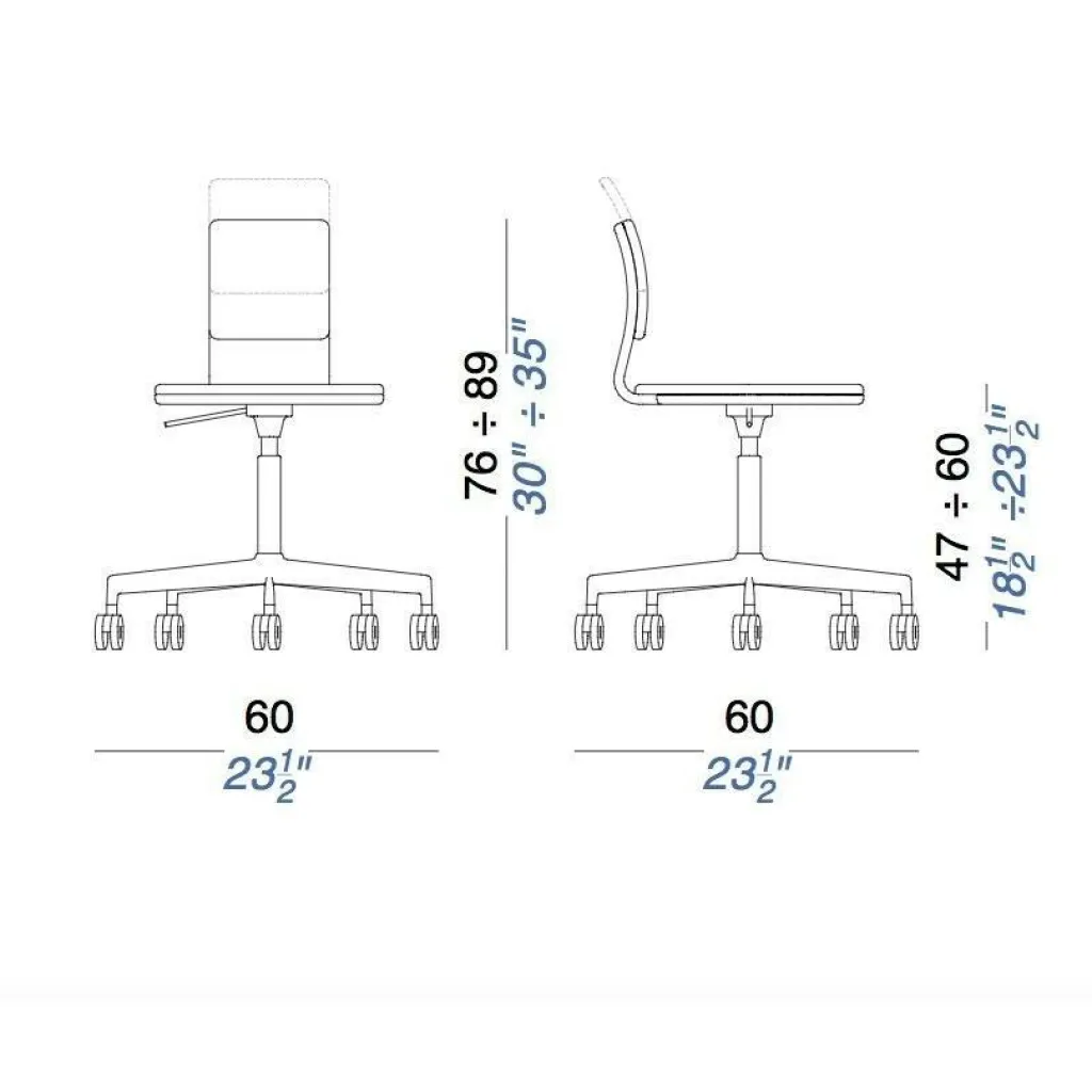 Das Untergestell des Lab S70 Drehhocker/Bürostuhl wurde aus lackiertem Aluminium-Druckguss gefertigt. Die Sitzhöhe lässt sich mit einem seitlich angebrachten Hebel zwischen 47 cm bis 60 cm stufenlos einstellen. In der obersten Position hat der Bürostuhl eine Gesamthöhe von 89 cm. Die Sitzfläche ist in jede Richtung drehbar und bietet optimale Flexibilität. Sitz- und Rückenpolster bestehen aus elastischem Polyurethan-Schaum und sind mit einem strapazierfähigen Stoffgewebe bezogen.