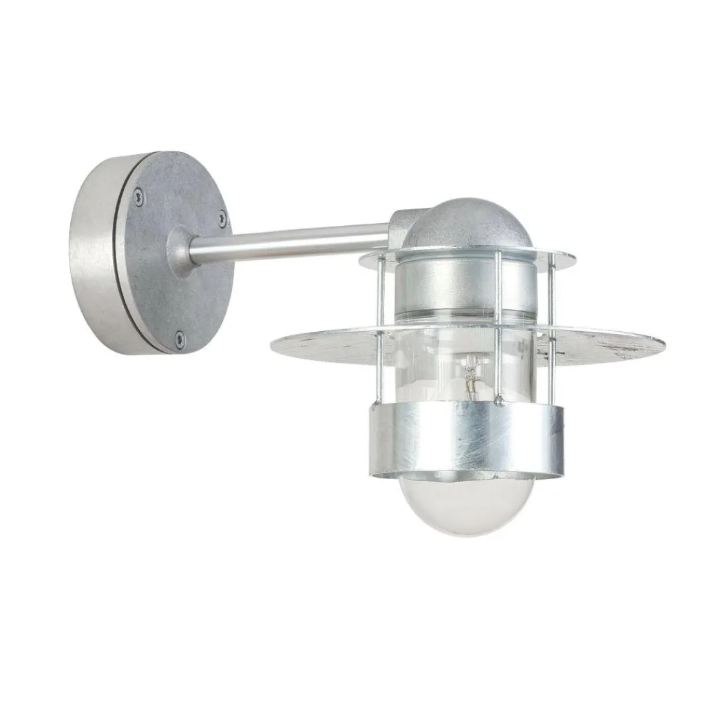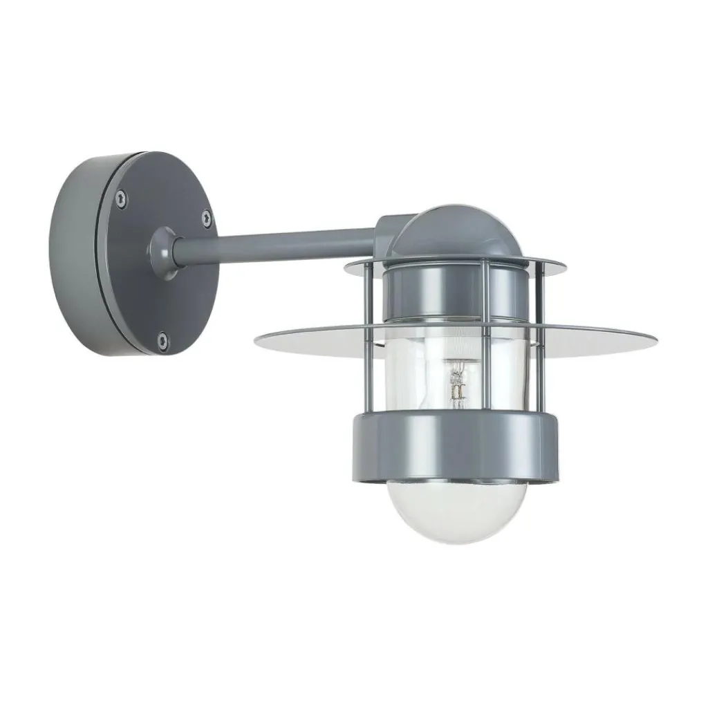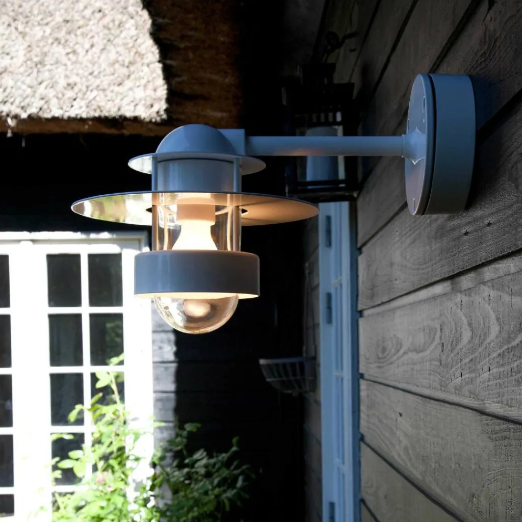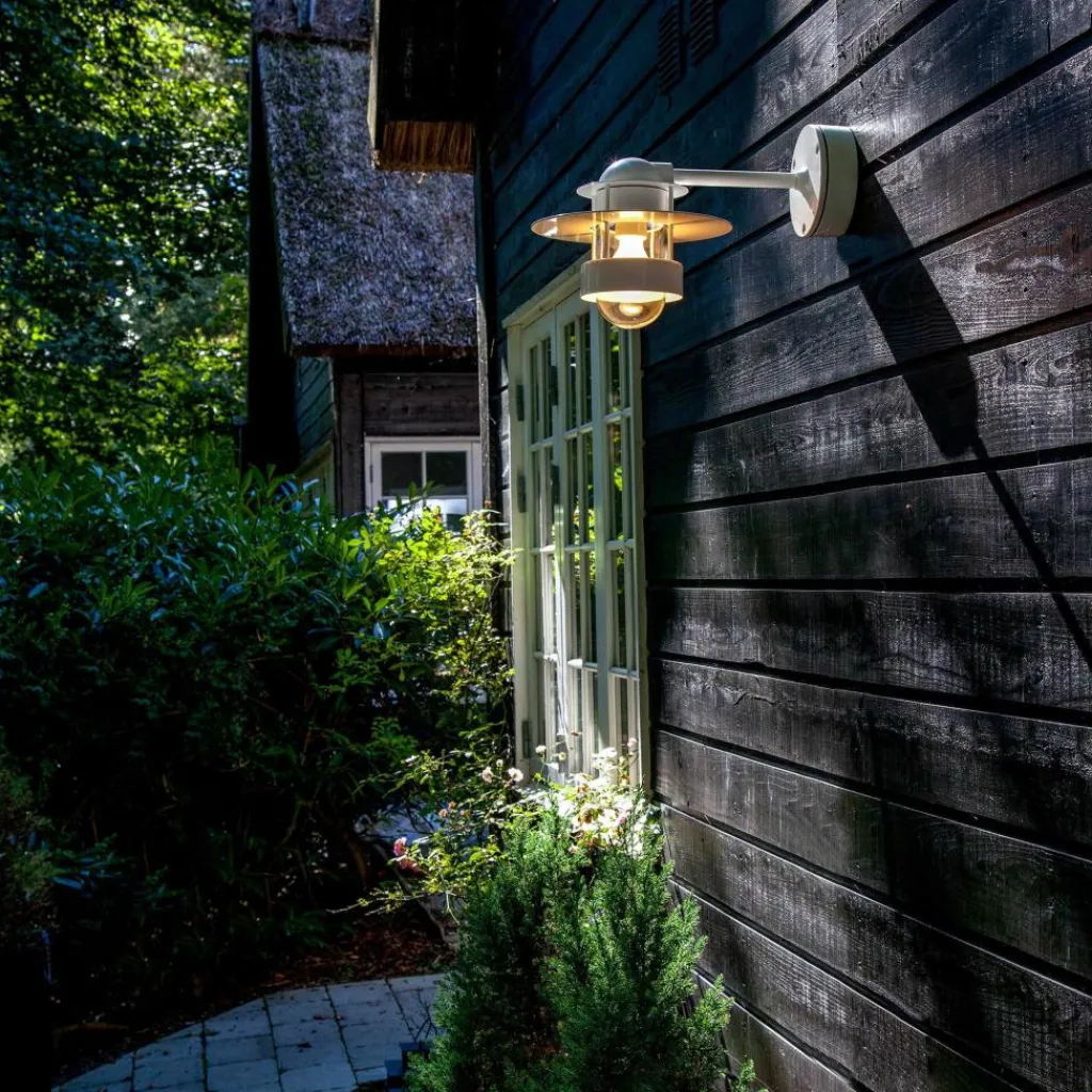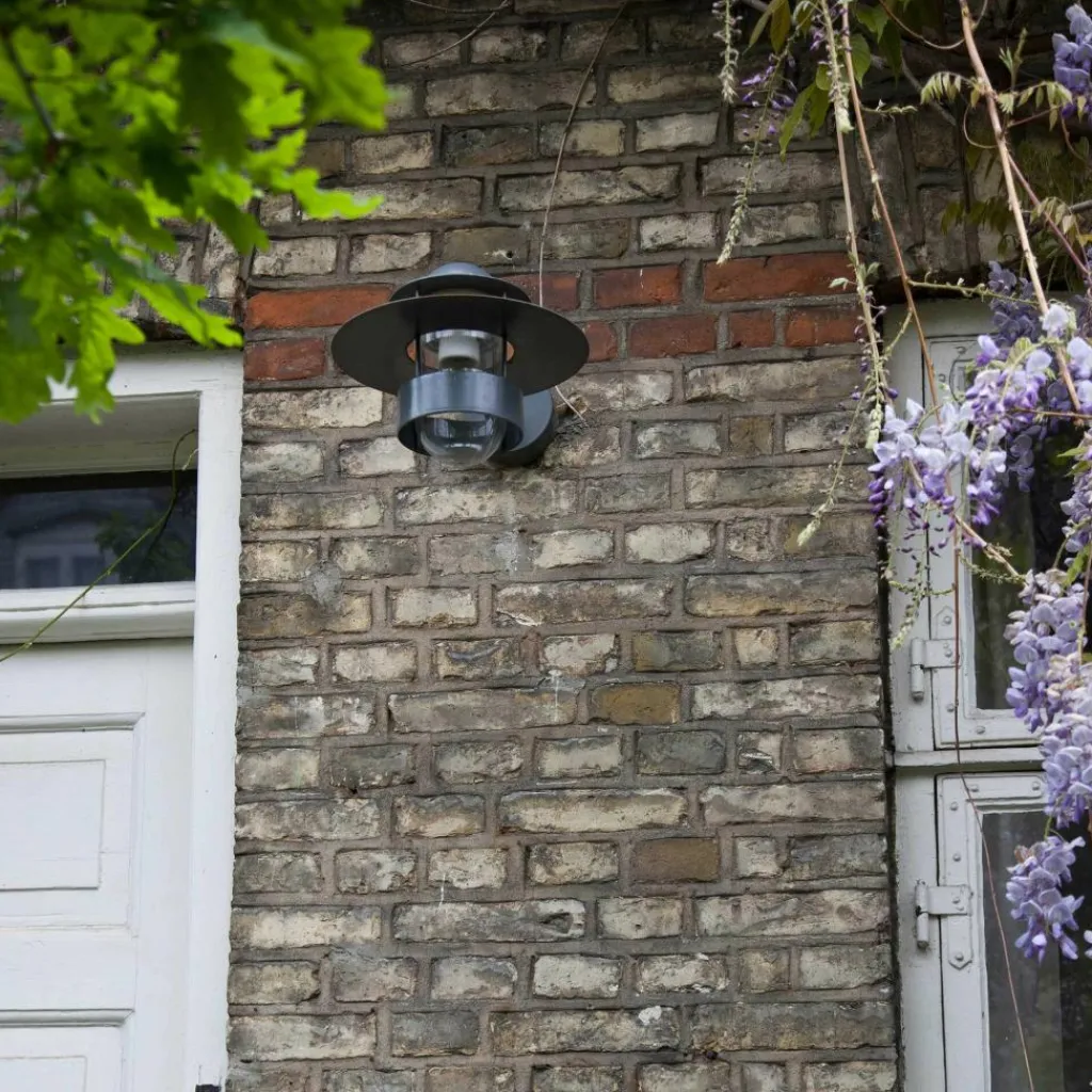 Mit ihren charakteristischen Stahlringen, die sich an einen zylindrischen Glaskolben mit dem Leuchtmittel schmiegen, versprüht die Albertslund Außenwandleuchte heute wie einst einen futuristischen Charme. Ein breiter Streifen dient als Abblendring, der verhindert, dass der Leuchtkörper in horizontaler Richtung blendet. Der Saturnring, der oberhalb des Leuchtmittels sitzt und die Form einer Ringscheibe hat, reflektiert einen Großteil des Lichts nach unten, während ein schwacher Schein am Glaskolben vorbei nach oben scheint und die Leuchte selbst erhellt. Damit erzeugt die Albertslund Außenwandleuchte ein symmetrisches Licht, das harmonische Schatten an die Wand wirft. Getragen wird die Ringkonstruktion von vier runden Metallstäben, die gleichmäßig um den Glaskolben verteilt sind. Der robuste Wandarm besteht aus extrudiertem Aluminium. Dank ihres vertikal gerichteten Lichts erzeugt die Albertslund Außenwandleuchte ein Gefühl der Sicherheit beim Nachhausekommen im Dunkeln. Sie eignet sich daher gut für den Eingangsbereich oder die Garage und kann auch einen Weg entlang einer Gartenmauer erleuchten.