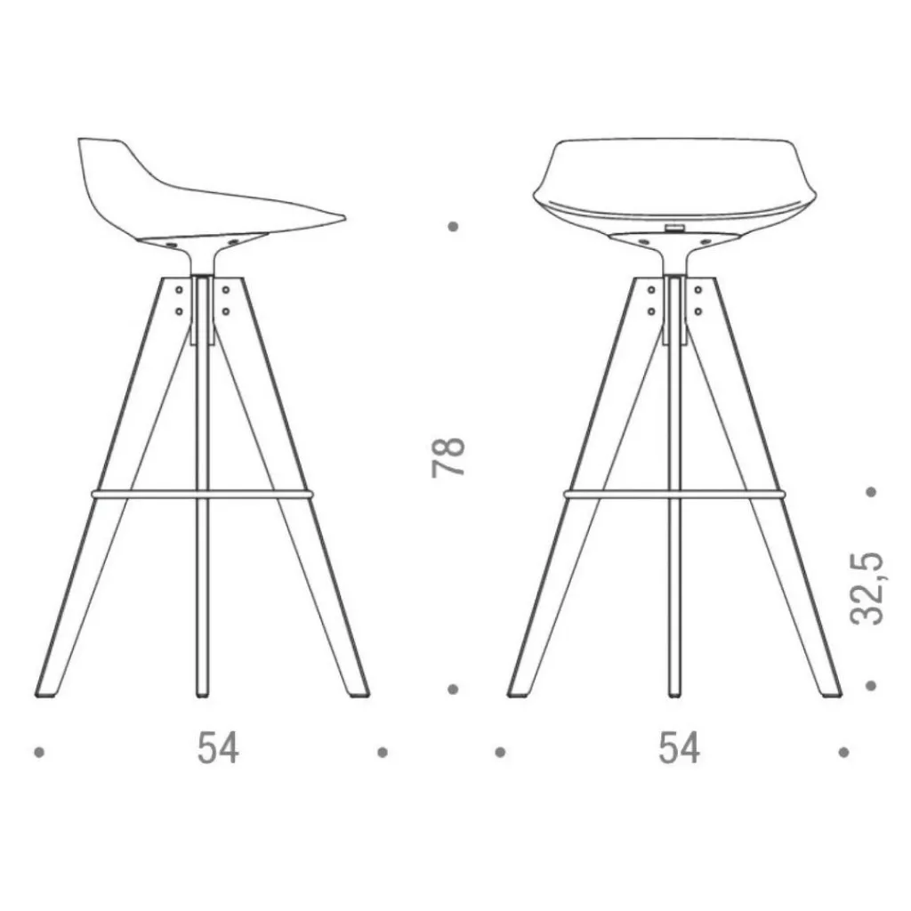 Die kantigen Eichenholzbeine laufen geometrisch genau im Zentrum der in einem komplexen Pressverfahren gefertigten Sitzschale zusammen und werden von einem Reifen aus Aluminium zusätzlich in der gewünschten Position fixiert. Der Sitz folgt mit seinen weichen Schwüngen sanft den Rundungen des Körpers und bietet höchsten Sitzkomfort.