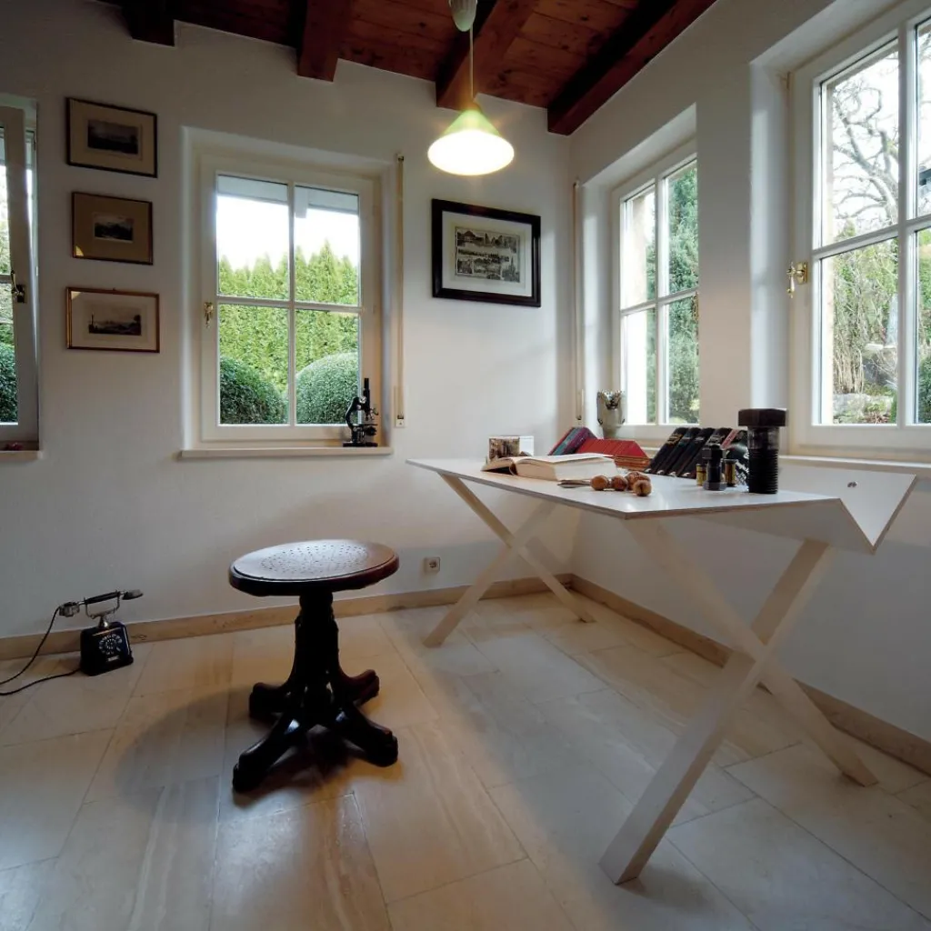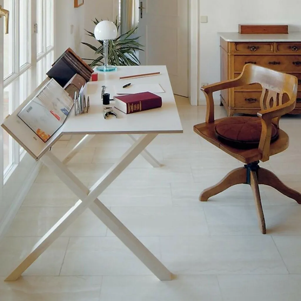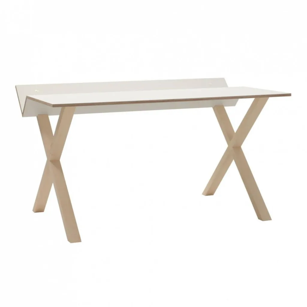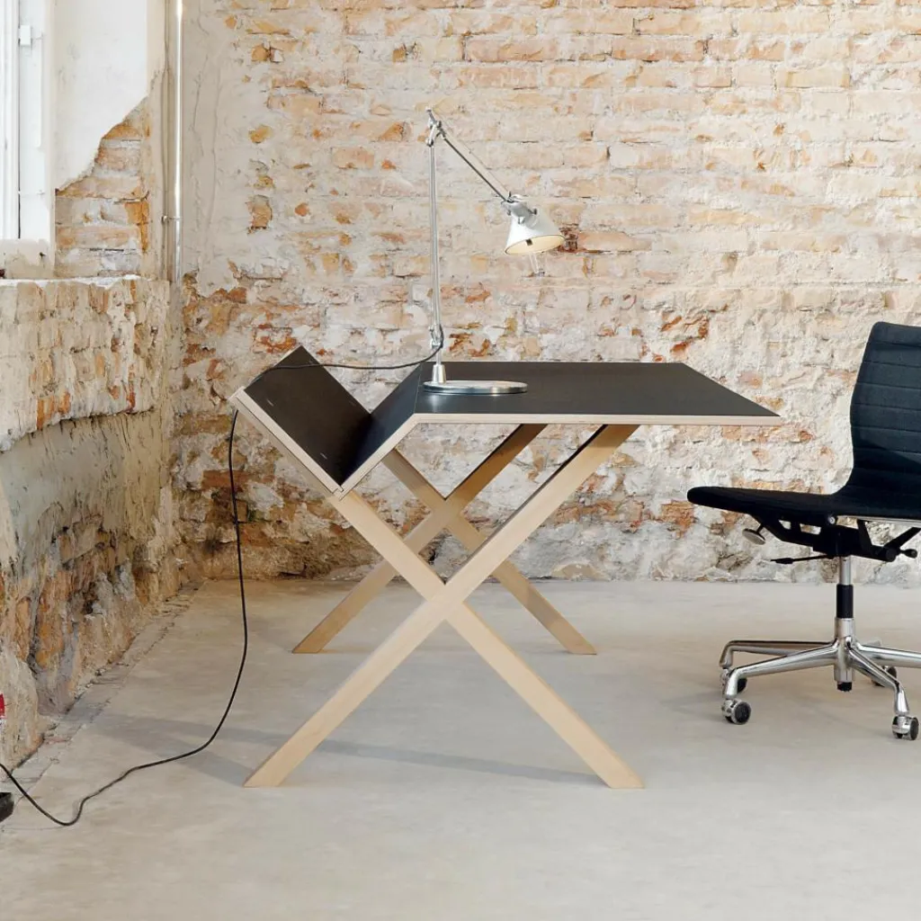 Als Blickfang des Kant Schreibtisches bringt der rechtwinklige Knick im kompletten hinteren Längsbereich als Stauraum für Bücher und Arbeitsmaterialien eine praktische Funktionalität und gleichzeitig eine interessante Ästhetik mit. So bleibt die Arbeitsplatte frei und in Anlehnung an den Namensgeber des Designs, den Philosophen Immanuel Kant, in reduzierter Formensprache sinnbildlich aufgeklärt und ordentlich. Der Knick geht direkt in die rechteckige und flache Arbeitsplatte über. Die Tischplatte mit Knick besteht aus einem FU-Kern aus Sperrholz und Birke und einer Oberfläche aus wahlweise seidenmattem Laminat oder Linoleum in verschiedenen Farben. Getragen wird die Platte von zwei Beinpaaren in X-Form aus Massivholz mit handwerklicher Holznut. Diese sind aus unbehandeltem Ahorn gearbeitet.