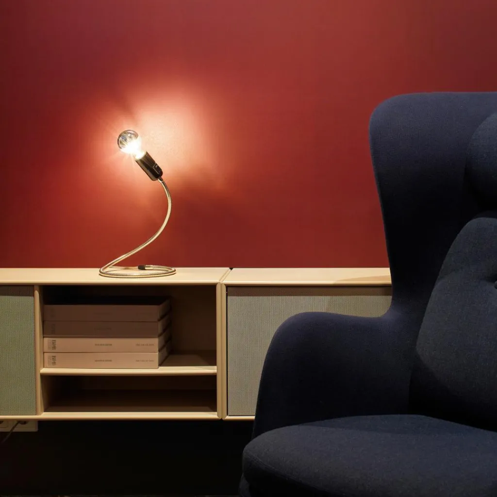 Die Lightworm Tischleuchte ist funktional und stilvoll zugleich: Das Untergestell aus Metall besteht aus unzähligen feinen Gliedern. Sie sind wie ein Duschschlauch beweglich und so kann die Lightworm Tischleuchte nach Belieben verstellt werden. Das macht sie zum Blickfang in jedem Raum: Dabei ist bei der Gestaltung der Kreativität keine Grenze gesetzt. Am unteren Ende des Gestells ist ein transparentes Kabel befestigt. An der Oberseite befindet sich eine Fassung aus Kunststoff, die als Halterung für das Leuchtmittel dient. Da die Lightworm Tischleuchte ohne Leuchtenschirm auskommt, wird das im Lieferumfang enthaltene Leuchtmittel mit einer E27-Fassung perfekt in Szene gesetzt.
