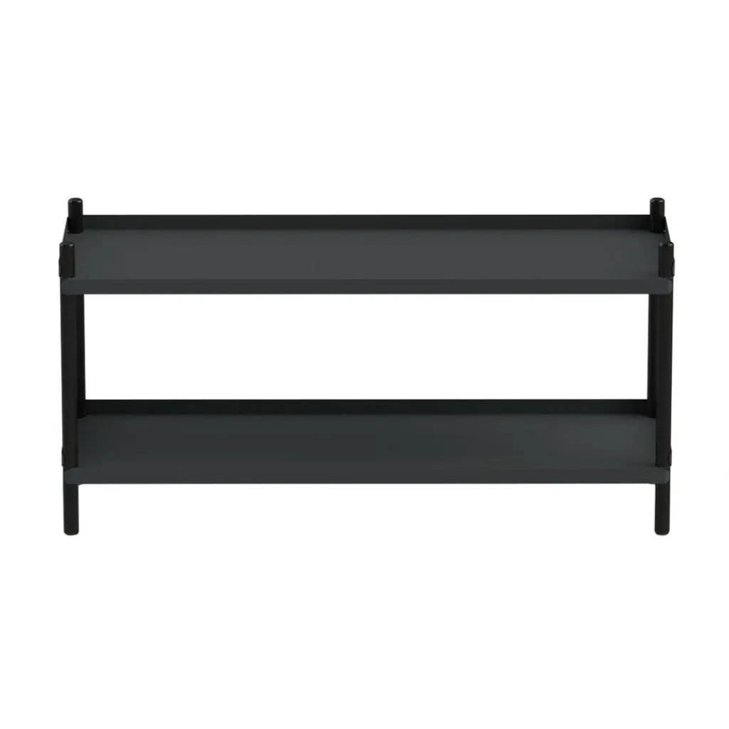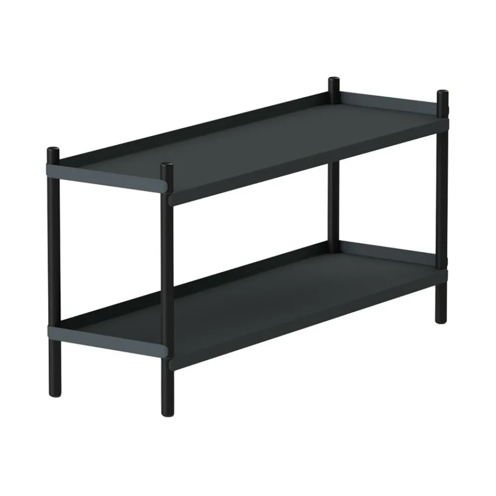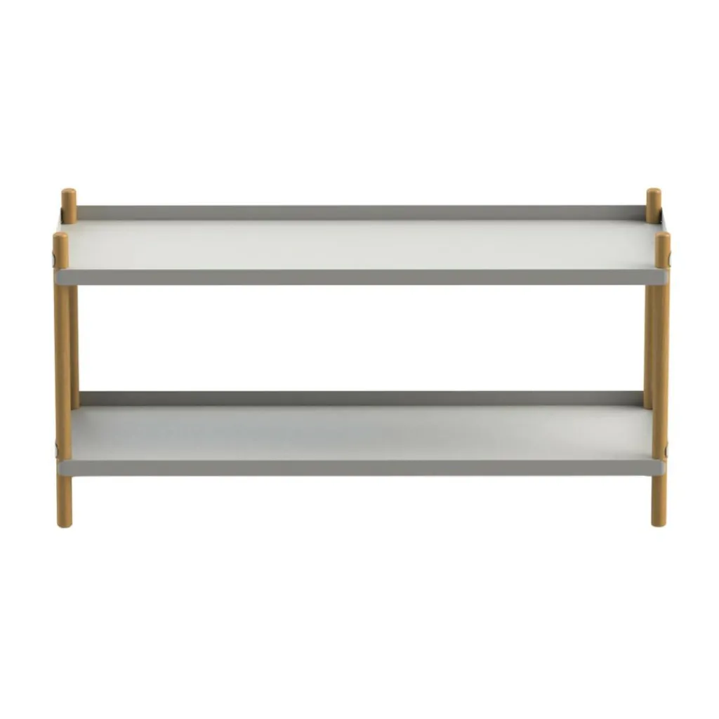 An das Design des Bolt Regal 100x53cm ging der deutsche Designer mit dem Vorhaben heran, möglichst wenige Elemente zu verwenden. Und tatsächlich ist das Bolt Regal 100x53cm ein perfektes Beispiel für moderne funktionale Möbel. Es reduziert sich auf 4 Stäbe aus massivem Eichenholz. Sie bilden die robusten Beine des Bodenregals. Das Material wurde mit dem FSC®-Siegel ausgezeichnet, das die Herkunft aus nachhaltiger Forstwirtschaft attestiert. In die Beine sind Bolzen und Gewinde eingelassen, die zur Befestigung der beiden Regalböden dienen. Die zwei Abstellflächen mit 3 höheren Kanten seitlich und hinten bestehen aus pulverbeschichtetem Stahl. Die innovative Konstruktion ermöglicht es, das Bolt Regal 100x53cm völlig ohne Werkzeug zusammenzubauen. Es ist im Nu aufgebaut und kann ebenso schnell zerlegt und an einen anderen Ort transportiert werden.