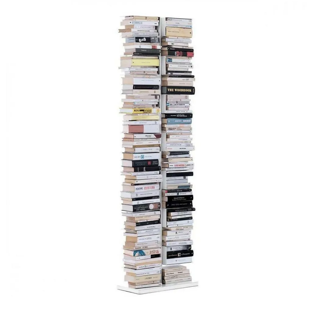 Das hier dargestellte Ptolomeo X2 besitzt eine Höhe von 180cm, besteht aus einem zentralem Ständer und einer Doppelreihe von Regalböden aus schwarzem oder weißem Blech. Die Basis des Regals besticht durch glänzendes Edelstahl. Sein Fassungsvermögen ist enorm, denn es nimmt circa 170 Bücher oder 560CDs auf! Dieses Ptolomeo X2 Bücherregal kann auch wunderbar als Trennelement mit zwei Vorderseiten verwendet werden.