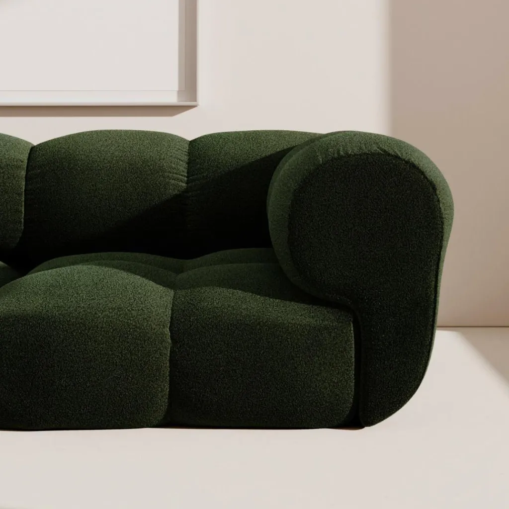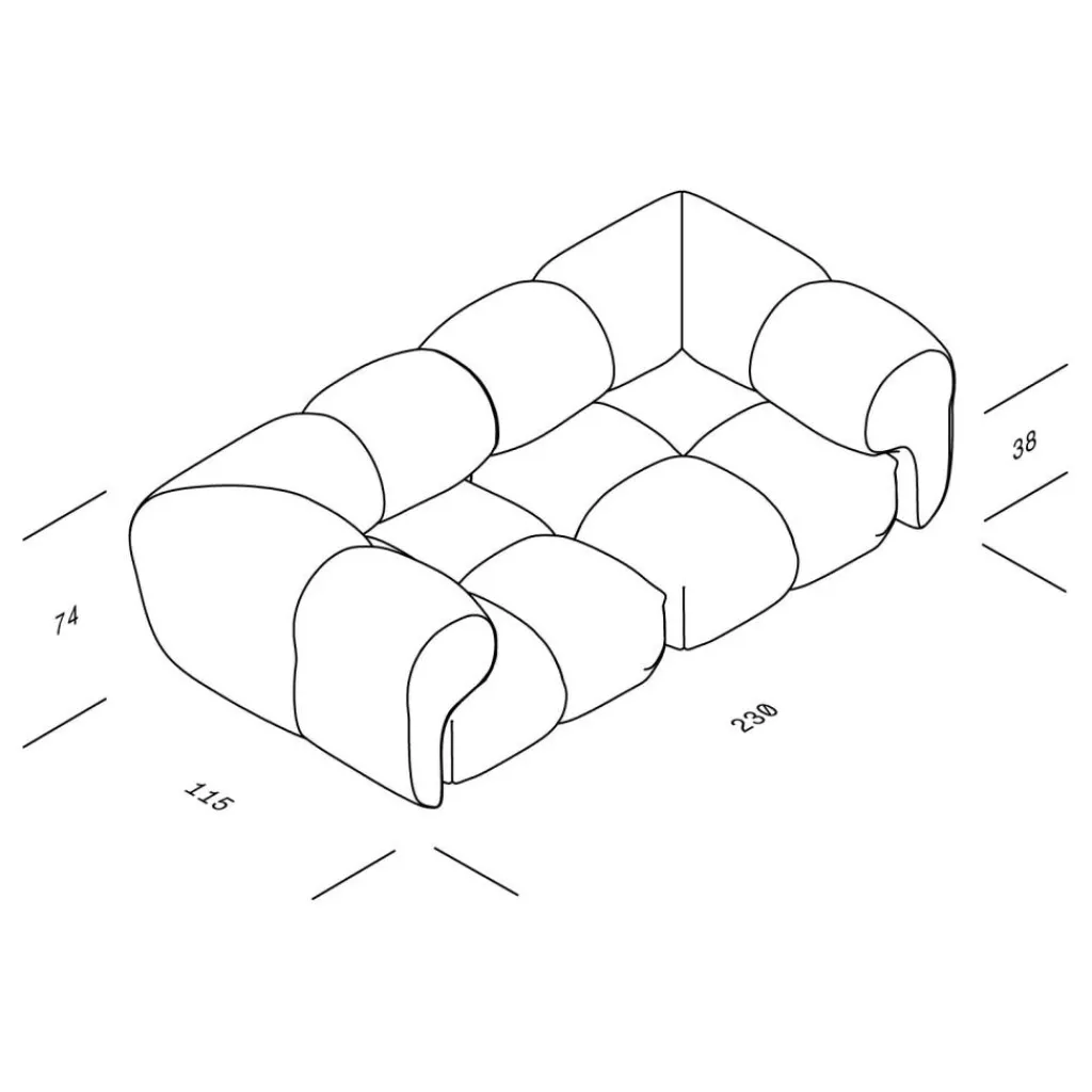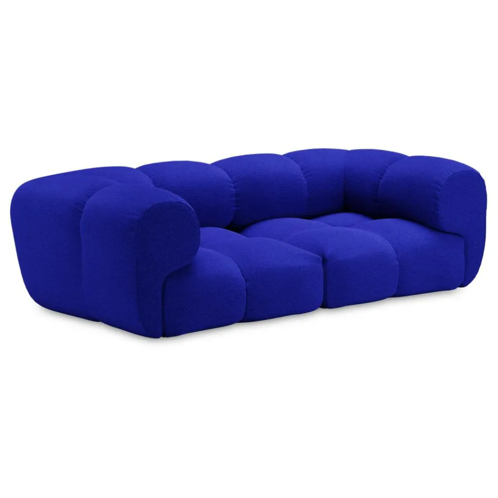 Üppige Polsterkammern verleihen dem Sander 04 2,5-Sitzer Sofa 230x115cm eine unkonventionelle, marshmallowähnliche Ästhetik und höchsten Komfort. Das 2023 designte Sofa besteht aus zwei quadratischen Poufs mit vier Kammern, einem Rückenteil mit zwei Kammern sowie zwei Eckmodulen, die als großzügige Armlehnen den Gemütlichkeitsfaktor des Modells zusätzlich erhöhen. Ohne Schrauben lassen sich sämtliche Elemente mit mitgelieferten Verbindern fest und bündig zu einem ultrasoften Sitzobjekt zusammenfügen. Die Polsterkammern umgeben einen Korpus aus robuster MDF. In ihrem Inneren verbirgt sich ein hochwertiger Federkern, der mit Kaltschaum und Polyethylenschaum gepolstert ist. Ein Extra an Bequemlichkeit gewährleisten Watte und Polsterfilz. Der von Hand genähte Bezugsstoff aus Polyester oder einer Nylon-Schurwolle-Mischung ist strapazierfähig, pflegeleicht und in verschiedenen Farben erhältlich.