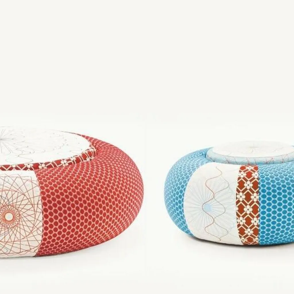 Der Donut Pouf besteht aus Patchwork-Dekorstoffen in verschiedenen Farben und Mustern. Der hohe Sitzkomfort wird durch das Übereinandersetzen verschiedener Polsterebenen garantiert. Das Holz-Gestell des Hockers wird mit einer Ebene halbstarrem Polyurethan-Schaum und Synthetik-Watte gepolstert. Das Sitzpolster ist weich, formstabil und äußerst bequem, da sie mit Polyurethan-Schaum und Gänsekiel versehen sind.