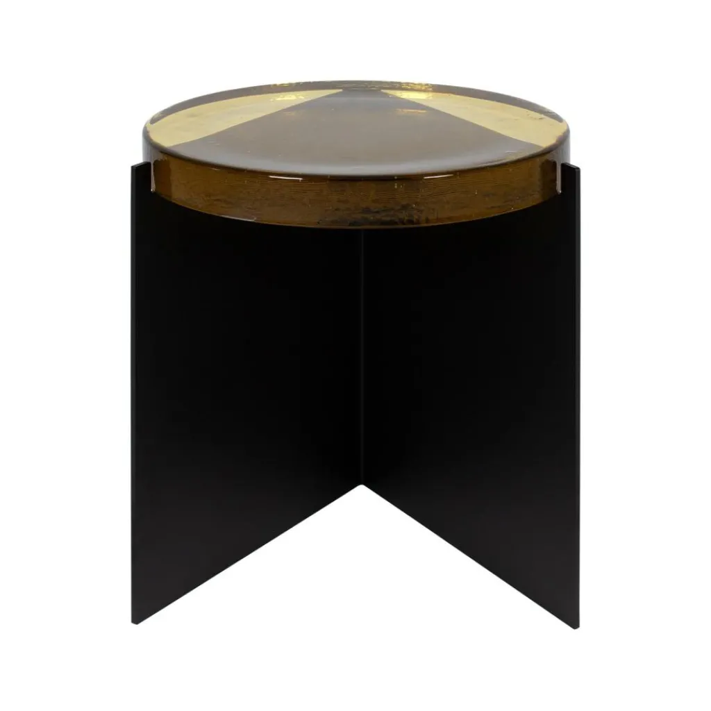 Die spezielle Struktur der Tischplatte mit 38 cm Durchmesser entsteht durch einen langen Fertigungsprozess: Flüssiges Glas gelangt in eine Form, wo es mehrere Tage aushärtet. Dabei entstehen einzigartige Einschlüsse und kleine Bläschen in dem Naturmaterial. Das Resultat sind 5 cm hohe Tischplatten, die sich mit ihrer Einzigartigkeit auszeichnen.