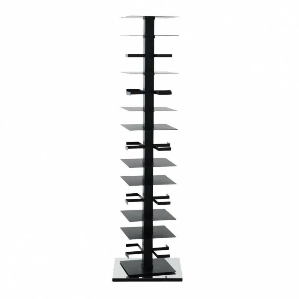Das Ptolomeo X4 C ist um 360° drehbar und in verschiedenen Größen und Ausführungen erhältlich siehe unter „Produktvarianten“ . Seine Struktur und Regalböden bestehen aus schwarzem oder weißem Blech, die Basis aus glänzendem Stahl. Sein Fassungsvermögen ist enorm, denn es nimmt bei einer Regalhöhe von 188cm entweder insgesamt 295 Bücher oder 175 Bücher und 340 CDs auf. Bei einer Regalhöhe von 110cm fasst es entweder 165 Bücher oder 105 Bücher und 170 CDs.