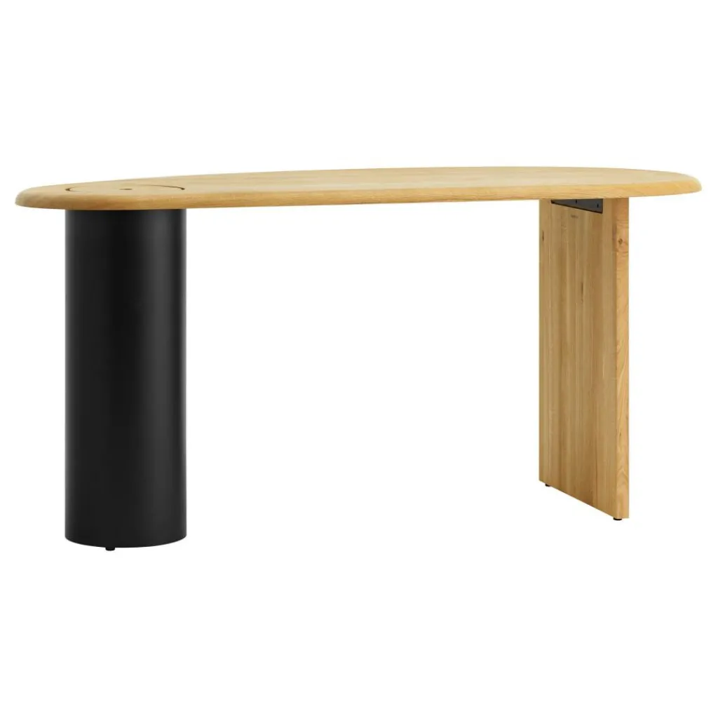Der skulpturale The Eclipse Schreibtisch ist ein praktischer Arbeitstisch, der sich für das Büro oder Homeoffice eignet. Mit seiner abgerundeten Tischplatte spricht er Freunde modernen Designs besonders an. Inspiration für den harmonischen Entwurf fand der Designer in Kieselsteinen, die er an einem Strand entdeckte. Sicheren Stand garantiert dem Modell auf einer Seite eine robuste Säule und auf der anderen Seite eine traditionelle Platte. In dem säulenförmigen Standbein findet man Stauraum für Büromaterial und andere Utensilien. Die runde Form findet sich in einem Kreis auf der Tischplatte wieder. Namensgebend sind Himmelskörper mit konkaven und konvexen Formen. Hergestellt wird der The Eclipse Schreibtisch aus massivem Eichenholz, die Säule allerdings besteht aus Stahl.