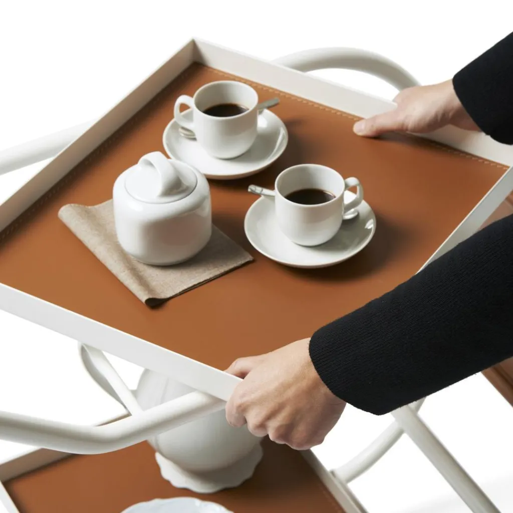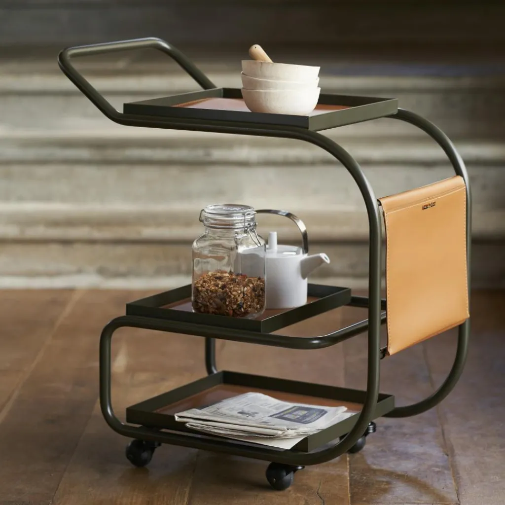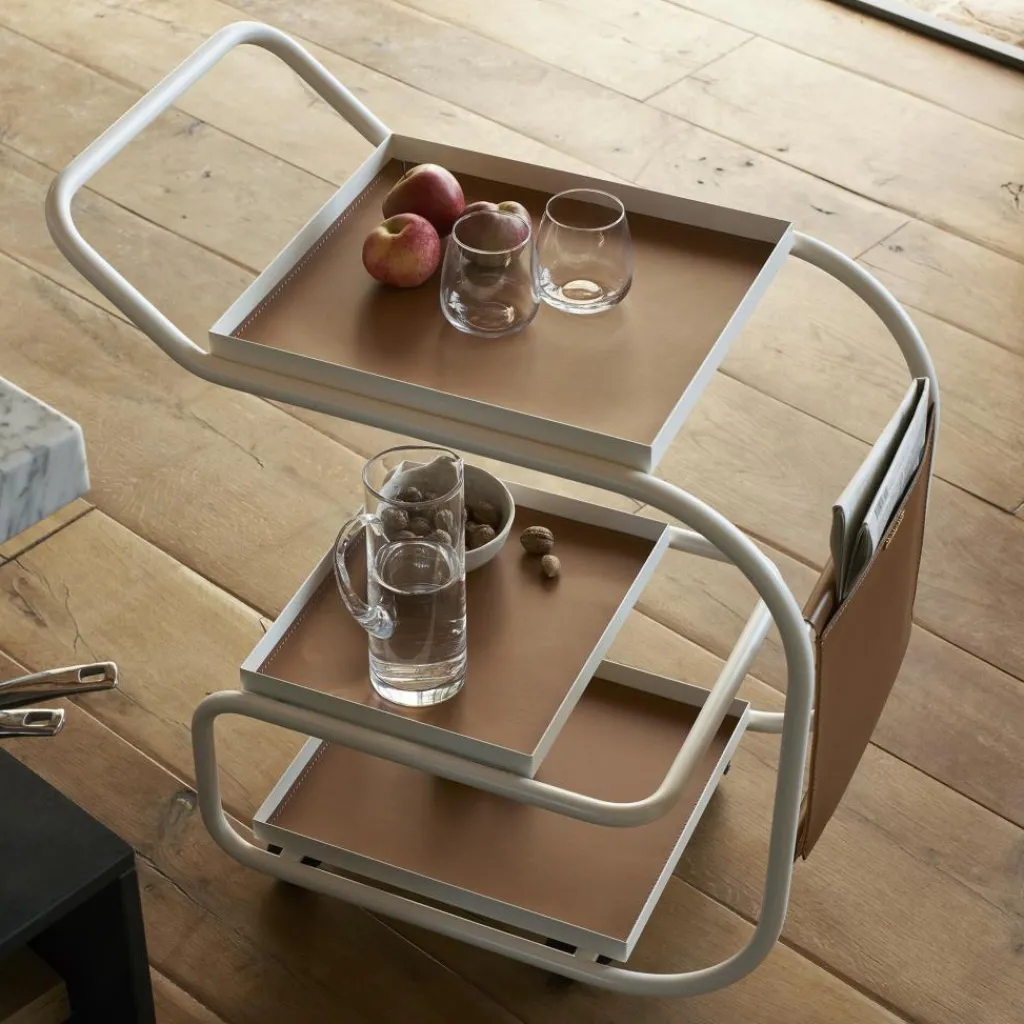 Der praktische Zenzero Servierwagen verläuft über drei Etagen, die durch ein harmonisch gebogenes Stahlrohrgestell entstehen. Auf jeder Etage befindet sich ein Tablett, das ebenfalls aus Stahl gefertigt ist. Zwei der Tabletts sind abnehmbar. So können sie zum Servieren oder als zusätzliches Dekorationsobjekt verwendet werden. Die Tabletts sind mit weichem Leder ausgekleidet. Aus dem gleichen Leder besteht die praktische Tasche, die an der Seite des Servierwagens zwischen den Stahlrohren angebracht ist. Hier können Zeitungen oder Bücher ideal verstaut werden. Auf dem Zenzero Servierwagen können Getränke, Speisen und andere Utensilien transportiert werden. Die vier schwenkbaren Lenkrollen an der Unterseite des Gestells lassen sich harmonisch über den Boden bewegen. Zur einfachen Handhabung trägt auch der handliche Griff bei.
