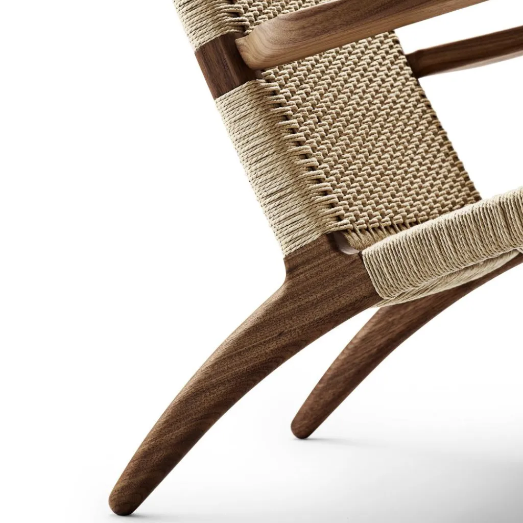Das seinerzeit als revolutionär geltende Einrichtungsmöbel ist stets eine interessante Ergänzung zu Ihren Wohnmöbeln. Das ausgefallene Design der nach hinten tiefer gelegenen Sitzfläche sowie den schräg verlaufenden Hinterbeinen ist ein Hingucker, der zu jedem Einrichtungsstil passt. Das feste, formstabile Walnussholz ist geölt und unterstreicht die elegante Note des Holzstuhles. Die leicht nach hinten geneigte Rückenlehne von 73cm Höhe, hohe Armlehnen von 55cm sowie die angenehme Sitzhöhe von 35cm sorgen für behagliche Bequemlichkeit. Die Sitzfläche nebst Rückenlehne besteht aus einem Geflecht aus naturfarbenem Papiergarn. Das Material, das bereits im Zweiten Weltkrieg als Ersatz für Wolle diente und zur Herstellung von Teppichen verwendet wurde, überzeugt sowohl mit klassischer Optik als auch mit weiteren positiven Eigenschaften. Robust, wasserabweisend, hygienisch und nachhaltig erfüllt der CH25 Sessel Gestell Walnuss mit einer Breite von 71cm, einer Höhe von 73cm und einer Tiefe von 73cm gehobene Ansprüche.