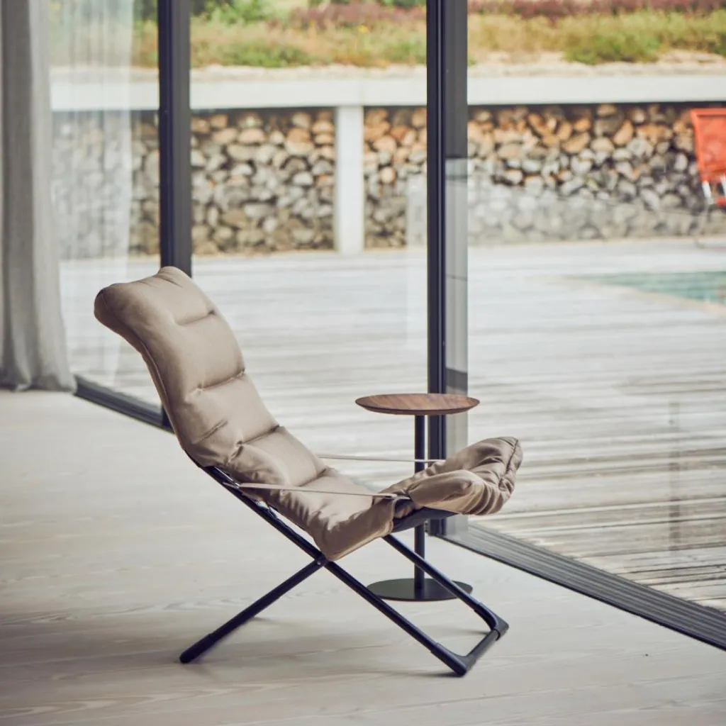 Für den Fiesta Sessel verwendet der Designer aus Italien eine Basis aus pulverbeschichtetem Stahl. Die geschwungene Rückenlehne lädt dazu ein, es sich bequem zu machen. Zum hervorragenden Sitzkomfort tragen die Armlehnen bei, die aus breitem Gurtband bestehen. Sie halten außerdem das dicke Sitzpolster an der richtigen Position. Das Polster ist mit Vlies gefüllt und hat einen Bezug aus Polyester. Der Fiesta Sessel ist mit bis zu 120 kg belastbar. Wird er nicht mehr gebraucht, kann man ihn wie einen Liegestuhl für den Garten zusammenklappen. Je nachdem, ob man lesen oder einen Mittagsschlaf halten möchte, kann man die Lehne verstellen.