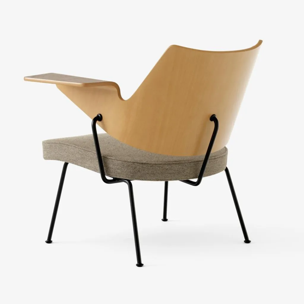 Seine abgerundeten Formen und die weichen Polster mit einer für Loungemöbel typisch niedrigen Form zeichnen den Royal Festival Hall RD8 Lounge Stuhl aus. Schalenförmig geht die gerundete Rückenlehne in die Armlehnen mit praktischen Armablagen über. Das Rückenteil ist aus formgepresstem Walnussfurnier und Buchenfurnier gearbeitet. Es ist mit filigranen Stahlrohrstangen mit dem pulverbeschichteten und CNC-gebogenen Stahlrohrgestell mit vier ausgestellten Beinen verbunden. Ein schönes Detail sind die sichtbaren Verbindungsknöpfe an den Armlehnen. Das Gestell mit Kunststoffgleitern trägt ebenfalls die großzügige Sitzfläche. Deren Basis besteht aus Buchenfurnier, das ebenso wie die Rückenlehne mit HR-Schaumstoff gepolstert und mit Stoff bezogen ist. Verschiedene Bezugsfarben mit einem Materialmix aus 70% Schurwolle und 30% Viskose stehen zur Auswahl.