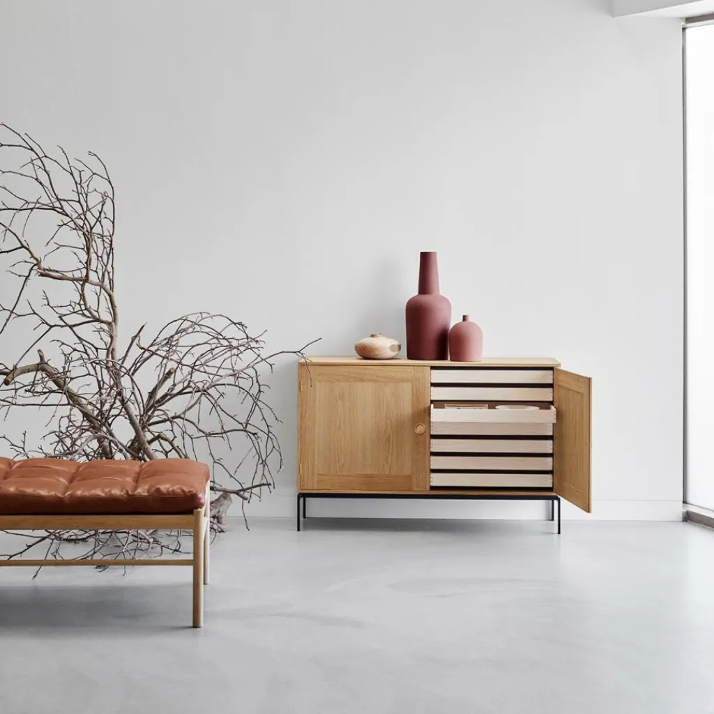 Das FK63-Regalsystem charakterisieren quadratische Module, die bei jedem Möbel als Grundgerüst verwendet werden. Dabei lassen die beiden Designer ihre Ausbildung als Schreiner und Schmied einfließen. Erstmals auf den Markt kam das FK63 Sideboard 112×36,2×72,5cm im Jahr 1963. Es erregte gleich Aufsehen und wurde von der Tischlerinnung mit einem Preis ausgezeichnet. Hergestellt werden die hochwertigen Möbel auf der dänischen Insel Fünen. Dort entsteht jedes FK63 Sideboard 112×36,2×72,5cm in hochwertiger Handarbeit. Hinter einer Tür sorgen 7 Einlageböden aus Eschenholz für Ordnung. Für den Korpus wird Eichenholz verwendet, das mit dem FSC®-Siegel ausgezeichnet ist. Somit stammt das FK63 Sideboard 112×36,2×72,5cm nachweislich aus nachhaltiger Forstwirtschaft. Einen spannenden Kontrast zum Korpus aus Holz bildet das filigrane Gestell mit vier Füßen. Dafür verwenden die Designer Stahl.
