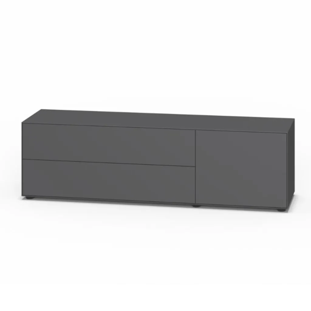 Die Nex Pur Box Schubkastenbox/Kommode 180×52,5cm ist Teil einer Kollektion und aus einer mitteldichten Holzfaserplatte MDF produziert. Die in der Farbe Weiß matt lackiert erhältliche Kommode hat die Abmessungen von 180cm in der Breite, 52,5cm in der Höhe und 48cm in der Tiefe. Die praktische Kommode mit viel Stauraum besteht aus zwei Schubläden auf der linken Seite und einem Fach, das mit dem Türanschlag auf der rechten Seite zu öffnen ist. Die mitgelieferten Gleitfüße der Nex Pur Box Schubkastenbox/Kommode 180×52,5cm von Piure mit einer Höhe von 2,5cm können dabei ganz einfach Unebenheiten des Fußbodens ausgleichen, um so für eine optimale Standfestigkeit zu sorgen. Die Tür der Kommode verfügt über ein Push-Pull-System. Diese auch Soft-Closing genannte Einrichtung ermöglicht fast geräuschloses Öffnen oder Schließen der Kommode, indem man nur ganz leicht gegen die Tür drückt.