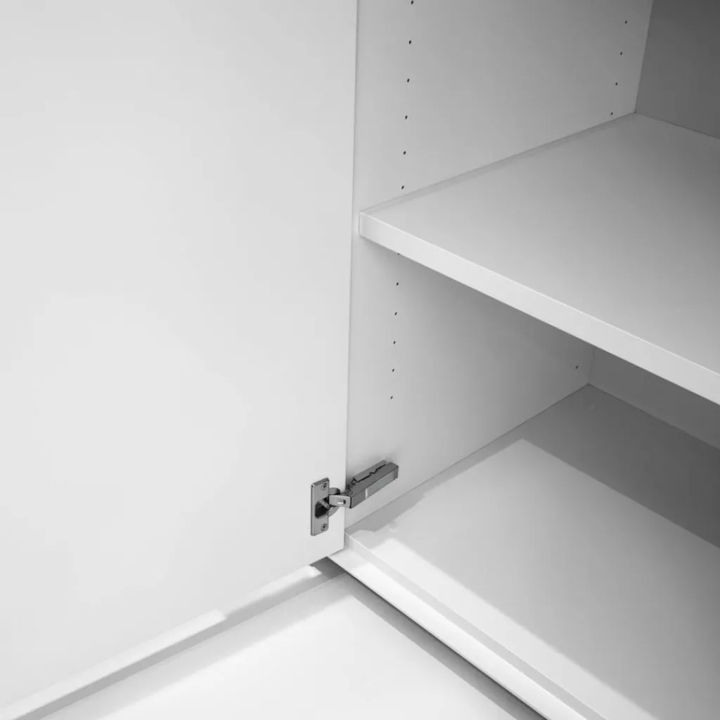 Das Nex Pur Box Sideboard 160x75x48cm zeichnet sich mit einer klaren Linienführung aus. Raffinierte Details machen es zur eleganten Erscheinung. Die dünnen Abdeckplatten und Seitenteile sind genau auf Gehrung geschnitten und passen exakt aufeinander. Zarte Schattenfugen rahmen den rechteckigen Korpus ein. Für das Nex Pur Box Sideboard 160x75x48cm verwenden die Designer MDF, eine mitteldichte robuste Holzfaserplatte, die matt lackiert ist. Die 2,5cm hohen Gleitfüße aus Kunststoff sichern festen Stand. Das Möbelstück ist klug eingeteilt: Auf der linken Seite befindet sich eine Doppeltür. Dahinter verbirgt sich ein höhenverstellbarer Einlageboden. Ebenfalls mit einem Einlageboden ist das Element auf der rechten Seite unterteilt, das mit einer Tür verschlossen und geöffnet wird. Die Oberseite bietet eine große Abstellfläche für viele Utensilien.