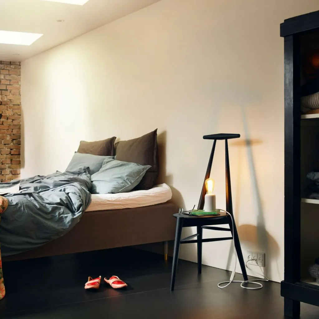 Markante Merkmale dieses Designstuhls sind die konisch zusammenlaufenden Rundstäbe, die die Stuhlbeine bilden oder sich zweiseitig zur Rückenlehne und den konstruktiven Verstrebungen zusammensetzen. Auch die kreisrunde Sitzfläche wird zum Rand hin dünner, sodass sie wie eine Scheibe wirkt. Sie liegt auf einem Dreiecksrahmen auf, dessen Ecken in die drei Beine eingespannt sind. Im Profil betrachtet, bildet sie eine Spiegelachse, die die beiden hinteren Stuhlbeine in Form der Lehne verlängert und dabei einen auffälligen Knick erzeugt. Der J157 Anker Stuhl ist aus hochwertigem Eichenholz aus nachhaltiger Produktion hergestellt. Die zarte Maserung der Oberfläche bildet einen attraktiven Kontrast zur geradlinigen Konstruktion des Sitzobjekts, das sich auch als Beistell- oder Nachttisch gut macht. Damit ist der J157 Anker Stuhl nicht nur ein extravagantes Designmöbel für den privaten Wohnraum, er eignet sich auch als Hoteleinrichtung.