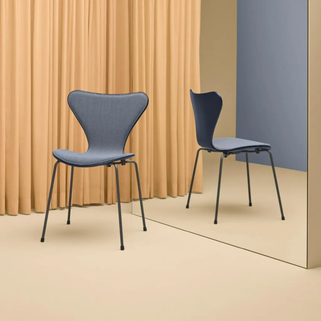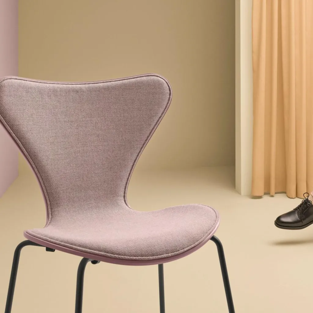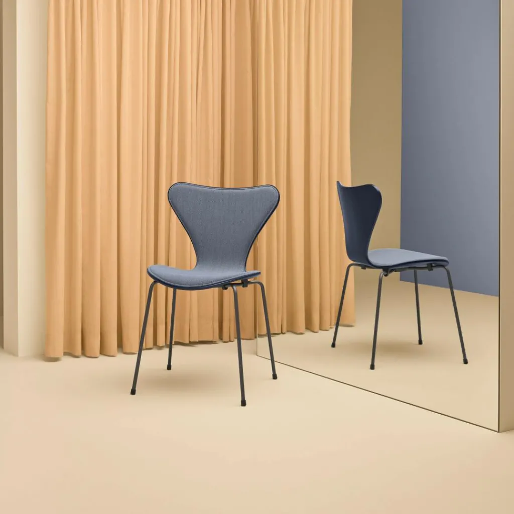 Ein scheinbar filigranes Gestell aus pulverbeschichtetem Stahlrohr sorgt für ideale Standfestigkeit. Die vier Stuhlbeine führen in einem Bogen unter der Sitzfläche zusammen. Sie ist aus formgepresstem Furnier hergestellt: Dafür werden Schichtholzblätter bei 122 °C unter Druck für zwei Minuten erhitzt und anschließend in die Form gepresst. So ist es möglich, Sitzfläche und Rückenlehne aus einem Guss zu fertigen. Darüber ist Stoff aus der renommierten dänischen Textilmanufaktur Kvadrat gespannt. Die Polsterung an der Vorderseite sorgt für besten Sitzkomfort. Der Serie 7™ Stuhl Vorne gepolstert Warmes Graphit ist in verschiedenen Farben erhältlich.