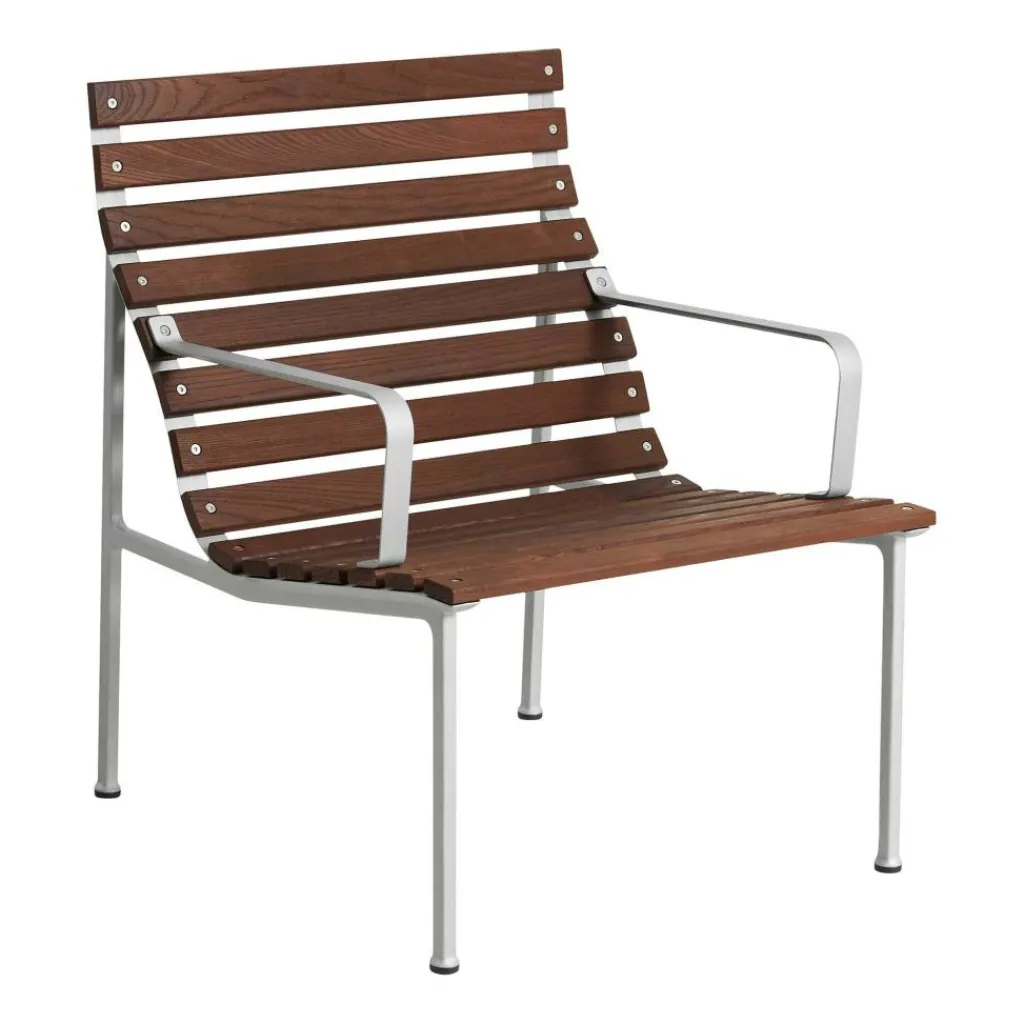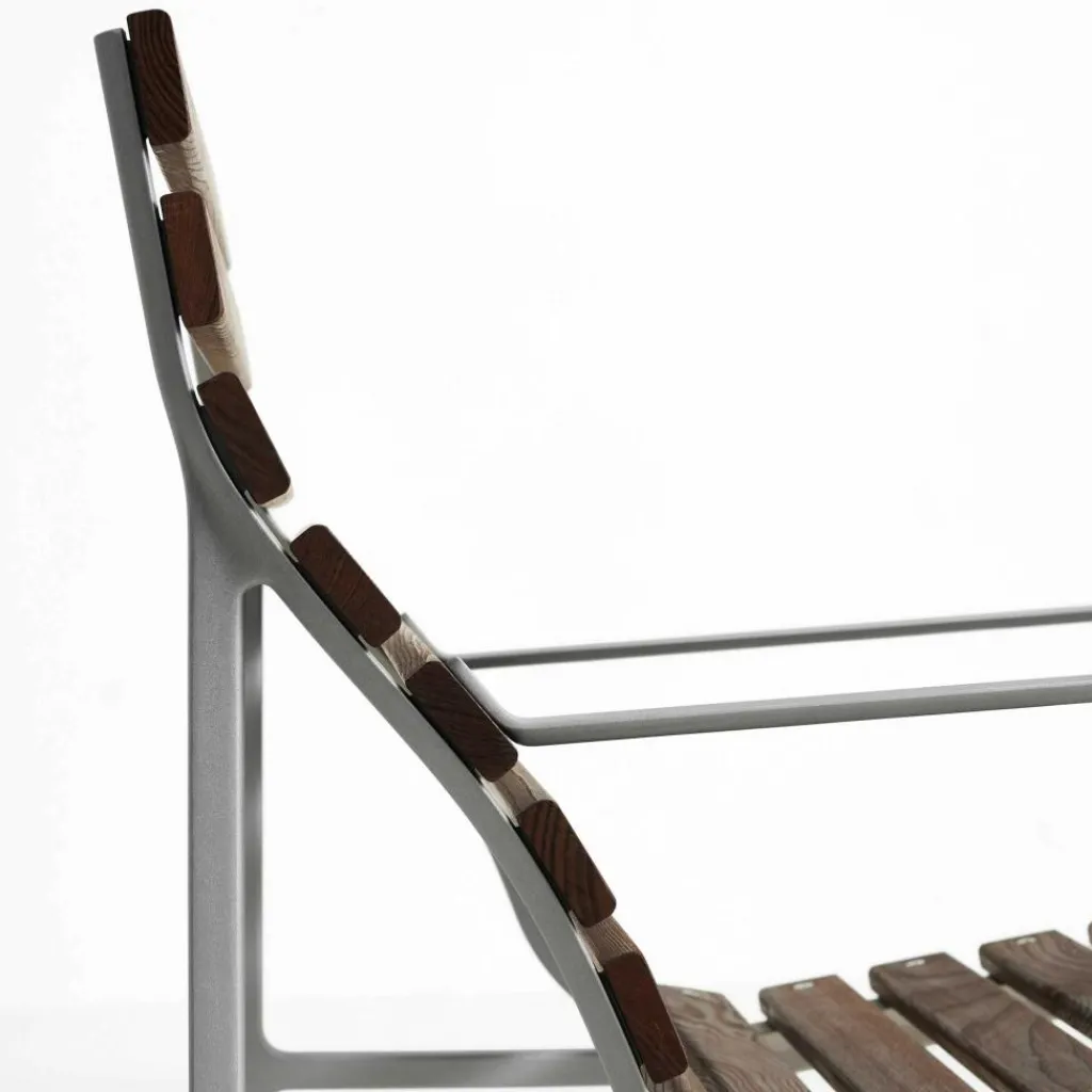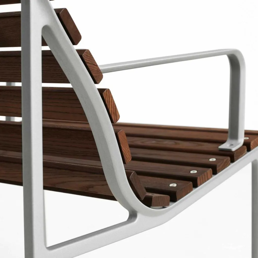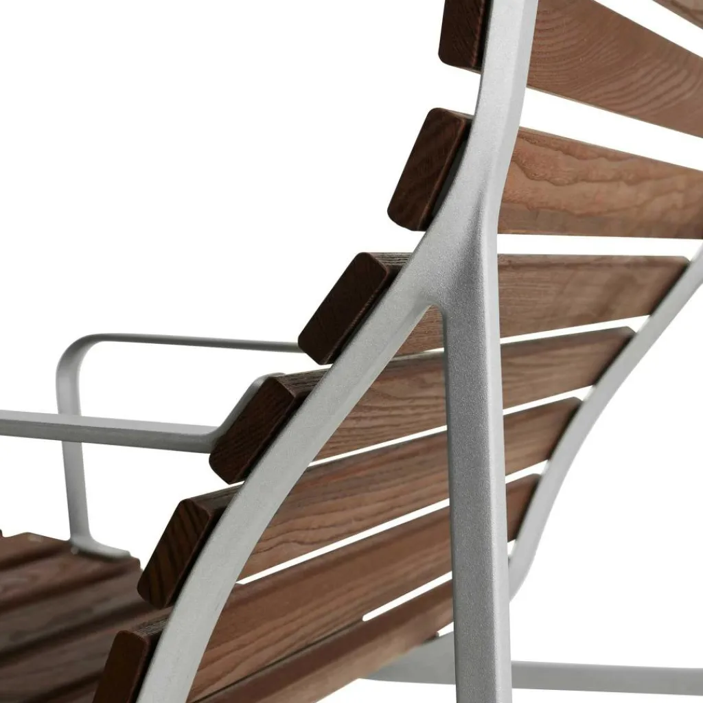 Die großzügige Form, die markanten Armlehnen aus flach gepresstem Aluminium und die niedrige Sitzhöhe von 36,5 cm signalisieren: Hier geht es ums Zurücklehnen, Loslassen und Draußensein – ganz ohne Kompromisse bei Komfort oder Design. Mit einer Breite von 63 cm und einer Tiefe von 70,5 cm bietet der Traverse Lounge Gartenarmlehnstuhl ausreichend Raum zum Sitzen und Anlehnen, ohne wuchtig zu wirken. Die Rücken- und Sitzfläche bestehen aus thermisch behandelter Esche, deren Oberfläche durch natürliche Hitze und Dampf extrem widerstandsfähig gemacht wird. Diese Behandlung verleiht dem Holz eine dunkle, warme Farbigkeit, die mit der Zeit eine silbergraue Patina entwickelt – eine gewünschte Verwandlung, die dem Stuhl Charakter und Tiefe verleiht. Der Rahmen aus druckgegossenem Aluminium ist nicht nur robust, sondern bewusst leicht gehalten. Mit einem Gewicht von 10,9 kg lässt sich der Stuhl flexibel platzieren. Die Oberfläche des Aluminiums ist kugelgestrahlt und mit einer klaren Schutzlackierung versehen, die Witterungseinflüssen trotzt und gleichzeitig die natürliche Struktur des Metalls sichtbar lässt. Die eingesetzten Materialien sind zum Großteil recycelt oder recycelbar und stehen für einen nachhaltigen Umgang mit Ressourcen. Pflegeleicht und langlebig konzipiert, verlangt der Traverse Lounge Gartenarmlehnstuhl nur wenig Aufmerksamkeit – regelmäßiges Nachölen der Holzflächen genügt, um das natürliche Erscheinungsbild zu erhalten. Kleine Risse oder Veränderungen in der Maserung sind Teil des Materials und beeinträchtigen weder Funktion noch Stabilität.
