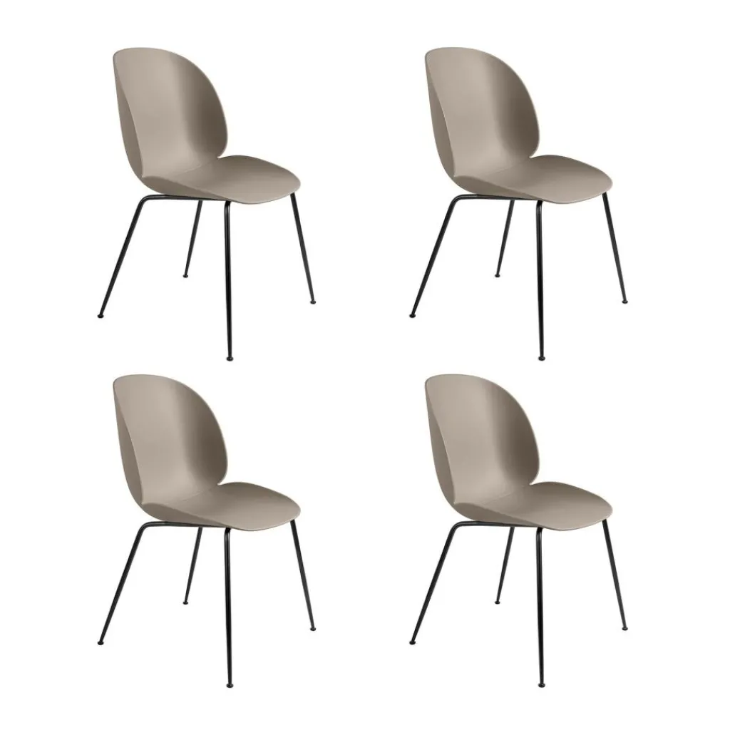 Das Beetle Stuhl Gestell schwarz 4er Set wurde von GamFratesi für die Marke Gubi entworfen. Es gehört zu einer Kollektion, deren Designs mit organisch geschwungenen Sitzschalen und filigranen Beinen auffallen. Damit lassen die Beetle-Stühle auf den ersten Blick an einen Käfer denken.